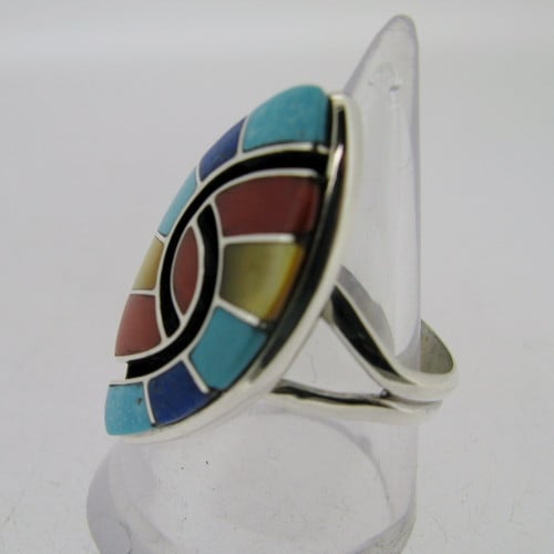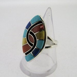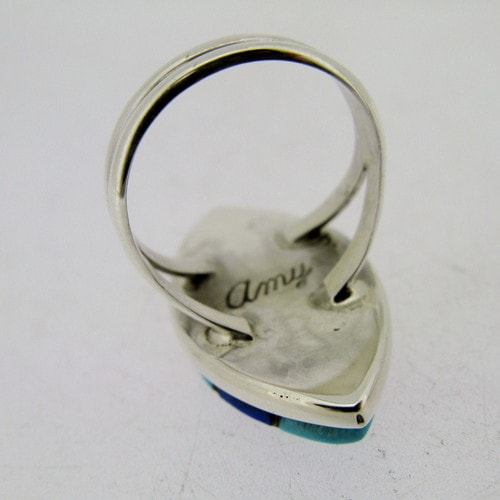 エイミー・ウェズリーはズニを代表するシルバースミスです。1953年生まれ、1976年よりシルバーワークを始めています。彼女の作品の代名詞ともいえる「ハミングバード・フレンドシップ」は二羽のハチドリがさえずりあっている様子をインレイでデフォルメして表したものです。ちょうどシャドーボックスの部分がそのハチドリを表しています。前夫がDickie Quandelacyというズニ族のシルバースミスなのも有名な話です。以前は一緒に製作していますが、1984年より、自身の名前である「amy」の刻印で活動を始めました。チャンネルインレイとシャドーボックスという二つの技法を掛け合わせた作品で、数々の受賞暦もあります。大体ながら細部まで繊細なのがエイミー・ウェズリーの作品です。同じモチーフでもアイテムによってみせる表情も様々です。