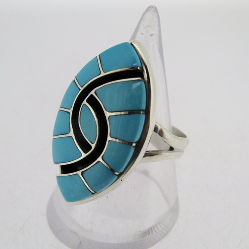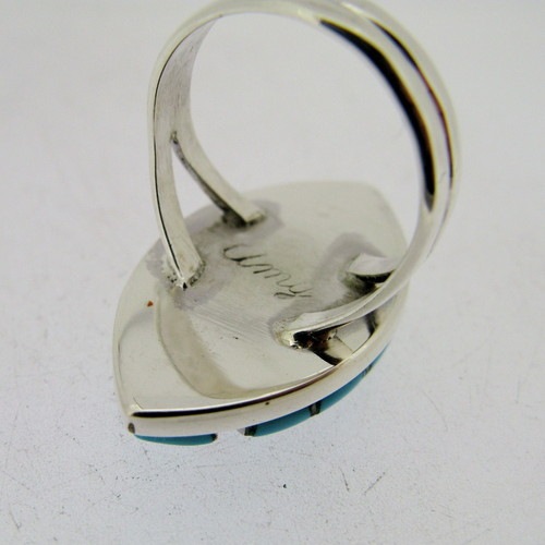 エイミー・ウェズリーはズニを代表するシルバースミスです。1953年生まれ、1976年よりシルバーワークを始めています。彼女の作品の代名詞ともいえる「ハミングバード・フレンドシップ」は二羽のハチドリがさえずりあっている様子をインレイでデフォルメして表したものです。ちょうどシャドーボックスの部分がそのハチドリを表しています。前夫がDickie Quandelacyというズニ族のシルバースミスなのも有名な話です。以前は一緒に製作していますが、1984年より、自身の名前である「amy」の刻印で活動を始めました。チャンネルインレイとシャドーボックスという二つの技法を掛け合わせた作品で、数々の受賞暦もあります。大体ながら細部まで繊細なのがエイミー・ウェズリーの作品です。同じモチーフでもアイテムによってみせる表情も様々です。