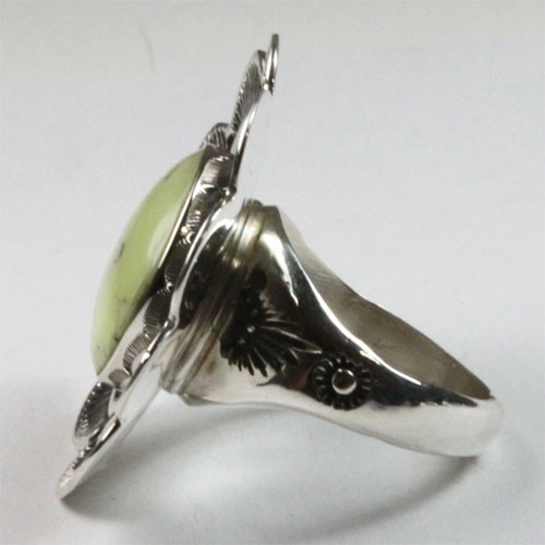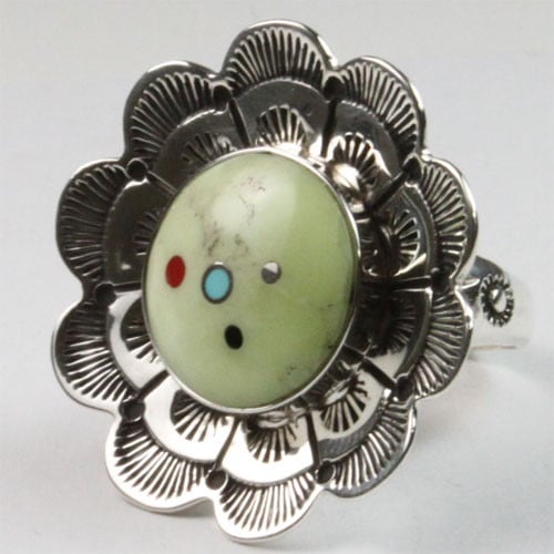 伝統技法を使いながら、インディアンジュエリーの枠に縛られない、華やかなリングになっています。