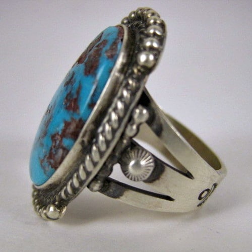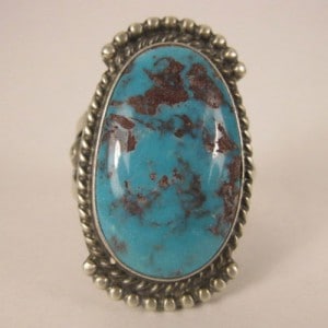 アリゾナ州にあるビズビーでとれるターコイズ。ビズビーも銅山で、ターコイズが発見されたのは6キロも深い地下だったそうです。そこからとれた石は深い紺~黒に近いような青色に茶色~黒のマトリックスが入っており、色が非常に特徴的で人気のあるターコイズの一つになっています。中でも、曇っているように見えるマトリックスが入っているものはスモーキービズビーやラベンダーなどと呼ばれ、コレクターアイテムの一つとなっています。青色が濃く、その中から染み出しているようなマトリックスが入っているものが人気が高く、高価になります。