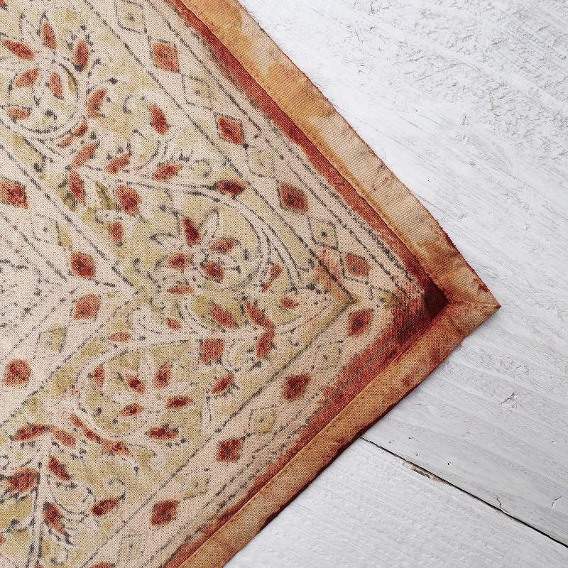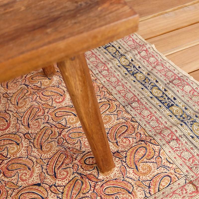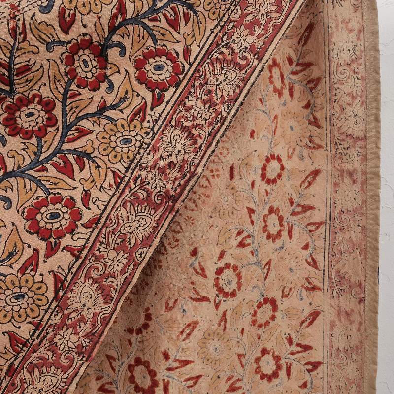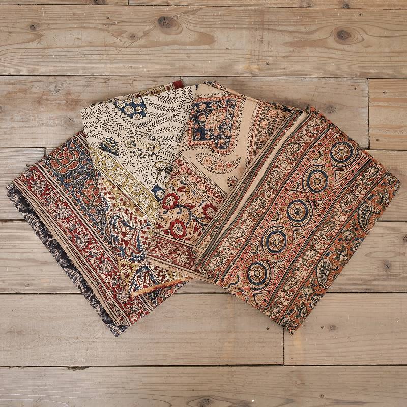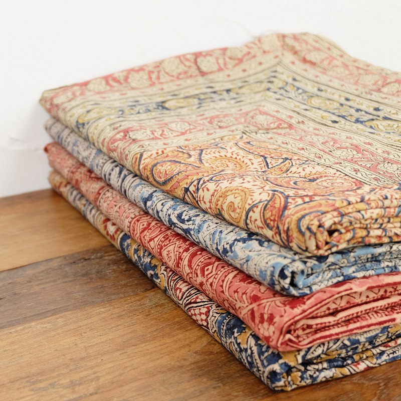 カラムカリとはカラムがペン、カリが仕事の意味で、竹の棒に巻きつけペンのように色を指していくインド伝統の技法です。手描きから徐々に木版を使うようになり、その後花唐草そのものをカラムカリとも呼ぶようになりました。プリントは天然染料を使った草木染めで、柄の一つひとつを木版のブロックで手押しして描き出していきます。色付けには木炭、ミョウバン、草花、インディゴ、茜、ウコンなどが使用されており、使うごとに色が馴染んでいき、素朴な色合いが表現されています。自然の力と昔ながらの手仕事でしか出すことができない落ち着いた色味がこのカラムカリの特徴です。