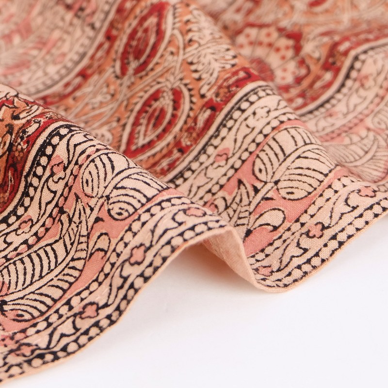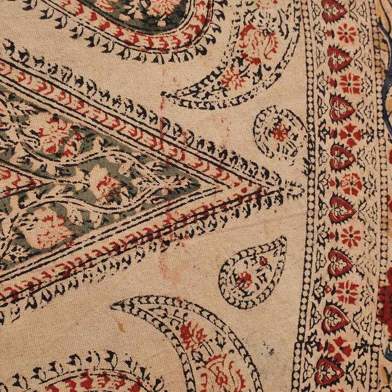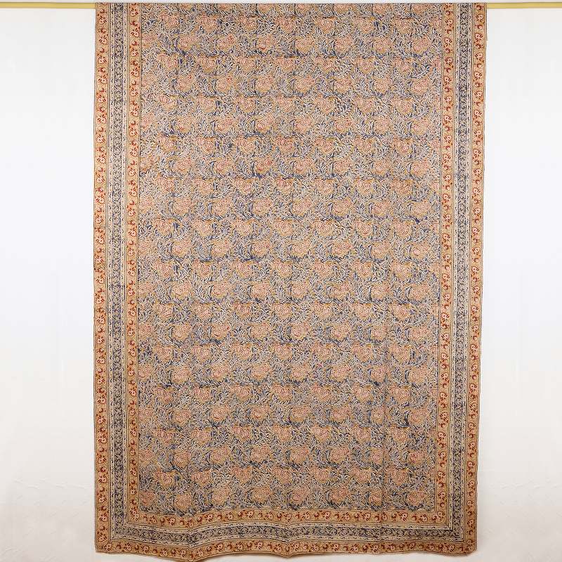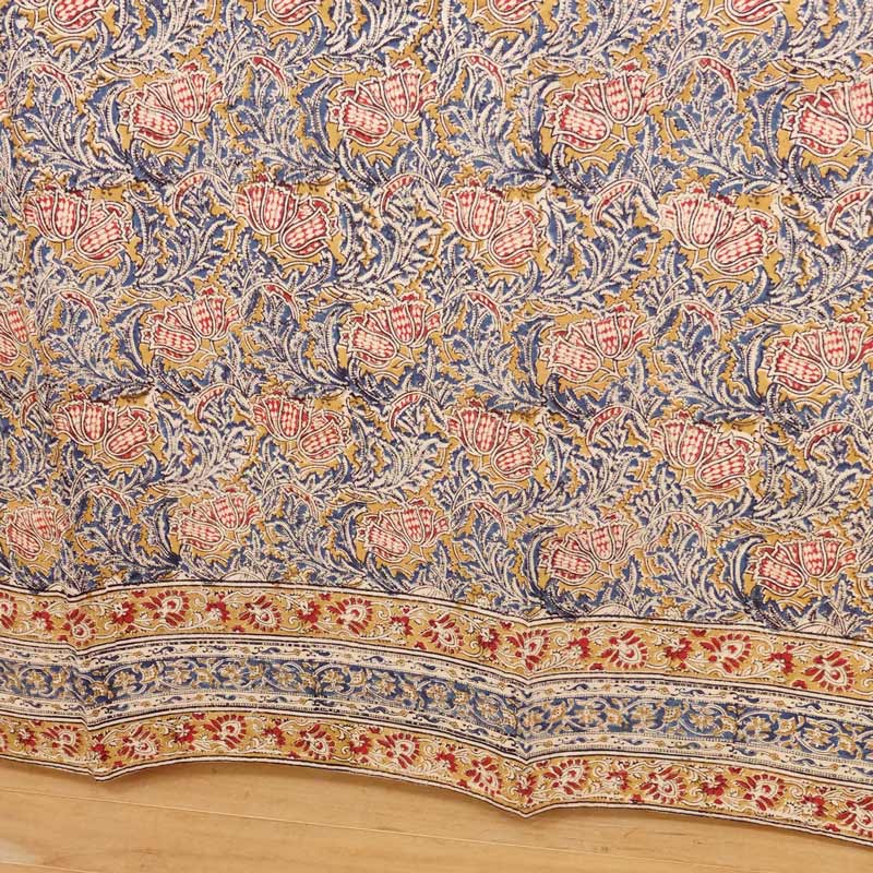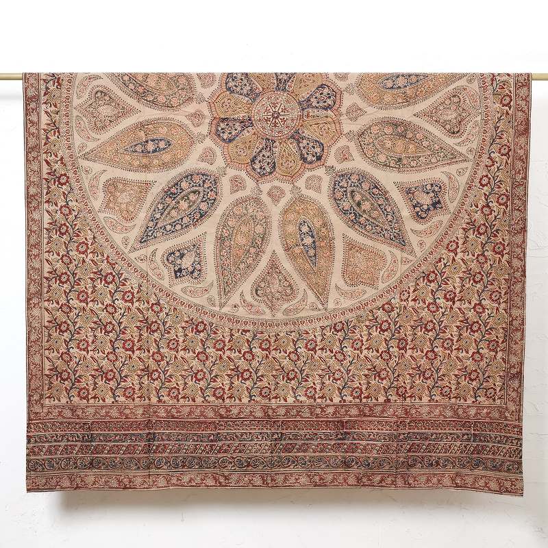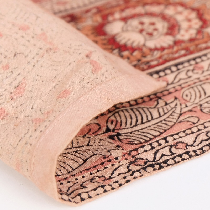 カラムカリとはカラムがペン、カリが仕事の意味で、竹の棒に巻きつけペンのように色を指していくインド伝統の技法です。手描きから徐々に木版を使うようになり、その後花唐草そのものをカラムカリとも呼ぶようになりました。プリントは天然染料を使った草木染めで、柄の一つひとつを木版のブロックで手押しして描き出していきます。色付けには木炭、ミョウバン、草花、インディゴ、茜、ウコンなどが使用されており、使うごとに色が馴染んでいき、素朴な色合いが表現されています。自然の力と昔ながらの手仕事でしか出すことができない落ち着いた色味がこのカラムカリの特徴です。