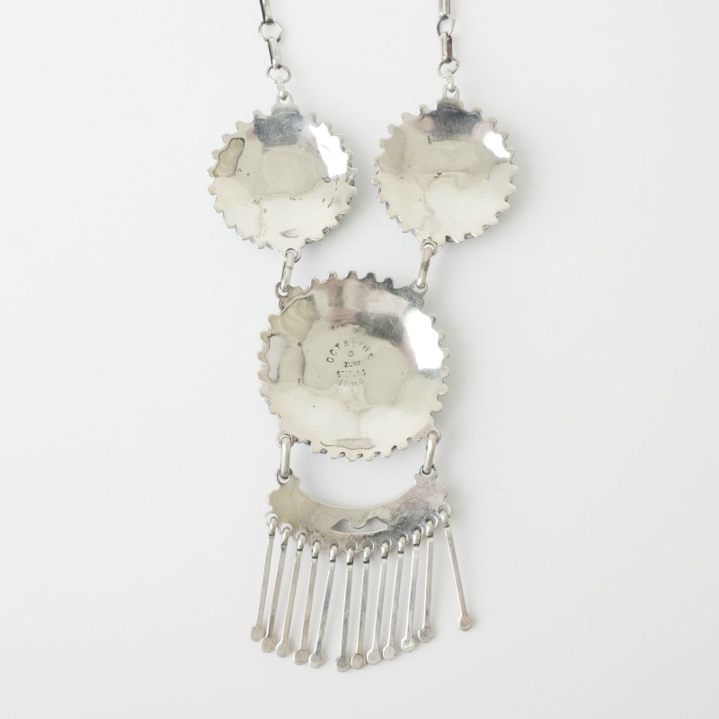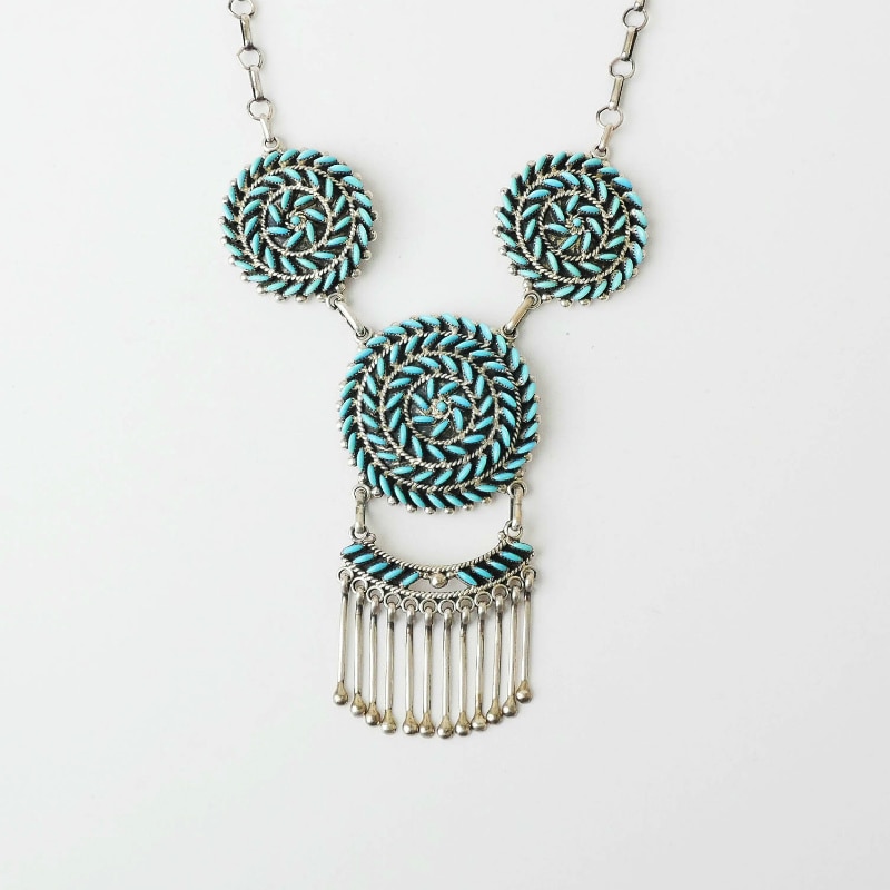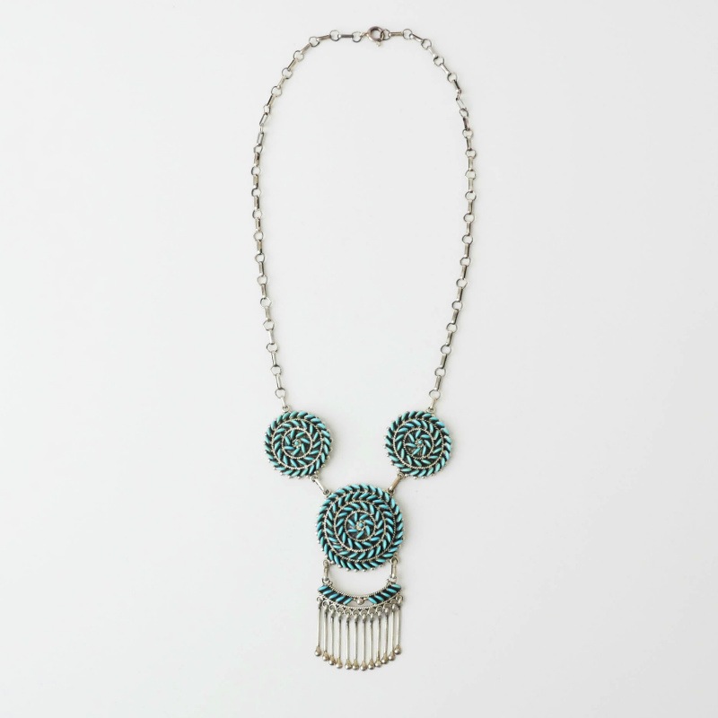 Irma&Octavius Seowtewaのスワールネックレスです。 トップと両サイドに大小3つの渦があしらわれています。Zuniで1920年ごろから作り始められた、ニードルポイントという小さな石と金属を組合せてゆくジュエリー。その最高峰が、このIrma&Octaviusの”スワール(渦)ジュエリー”です。 一つ一つの小さな石のかけらを、Irmaが美しい半月状に削り出し、Octaviusの製作したシルバーにはめ込んでゆきます。全て緻密で均一に仕上げられた美しいターコイズの渦。素朴な村の工芸品をハイジュエリーの域へと高めた夫妻の、大変美しいネックレスです。