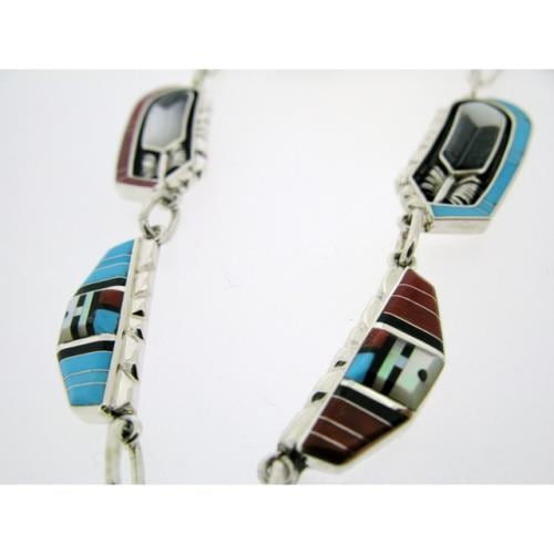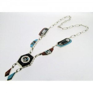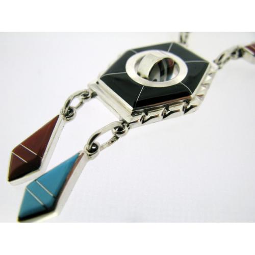 サンフェイスが回る、スピナーデザインと呼ばれるスタイルで人気のズニ族アーティスト、ドンデワ。インレイの細かさと美しさ、表面の滑らかな加工、そのデザイン性はジュエリーショーで数々の賞を受賞しており、世界中にファンがいます。