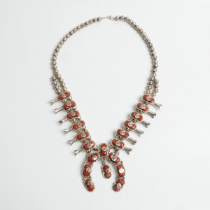 エフィーカラバサ作・コーラルをふんだんに使用したナジャネックレスです。エフィ作品の王道・石を抱いたスネークモチーフですが、圧倒されるのはその数。計20匹のスネークが連なってナジャネックレスになった圧巻のデザインです。シルバービーズは薄手を使い見かけより軽い仕立て、両サイドにはスクオッシュの花もついた本格派スクオッシュナジャ仕様です。2011年に入手したもので、この時点でもかなり希少だったもの。今となってはもっと入手しにくいものです。貴重な逸品を是非。