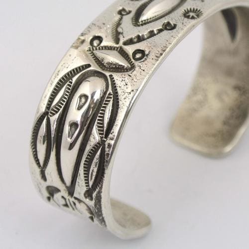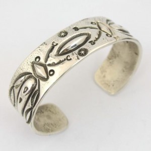 厚みのあるシルバーは昔の手法にこだわった、インゴットシルバー。スタンプは、1880年代から1930年代の古いスタンプをこの作品のために手に入れ、それを新しいスタンプと混合させて古いバグデザインを復刻した作品。もともとナバホ族は、家の中にいるバグ(昆虫や虫)を家を守ってくれるものとして信仰してきました。このバグデザインを唯一継承する巨匠マッキープラテロの技を肉眼で見ることのできる数少ないアーティストであるリンドン。その巨匠の代表作であるバグデザインを受け継いだ、貴重な作品です。厚みのあるシルバーとバグの作品は、マライカ限定のシリアルナンバー入りです。