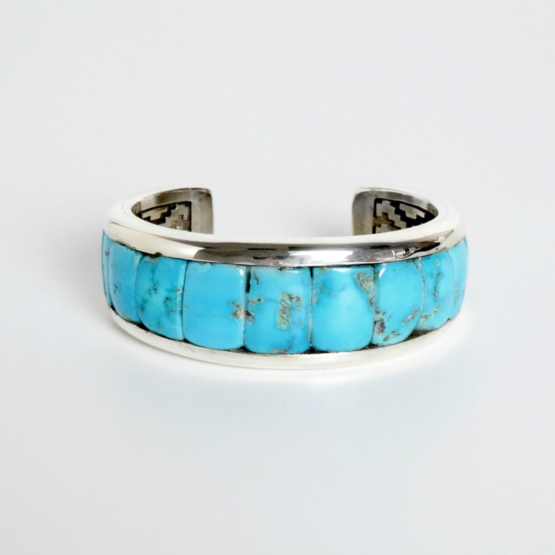ナバホ族。1941年生まれ、1964年制作開始。シルバースミスだった父親からシルバー制作を学び、母のナバホラグ、父のシルバーワークを融合させ作りだされたのがラグオーバーレイスタイル。ナバホ族の伝統的な手織りラグ(敷物)をモチーフにしたもので、著作権をとっています。細かいカットと表面になされた加工が美しく、シンプルで年代を問わず何にでも合わせられる本物のジュエリーとして、日本のみならず世界各国のバイヤーに人気があります。