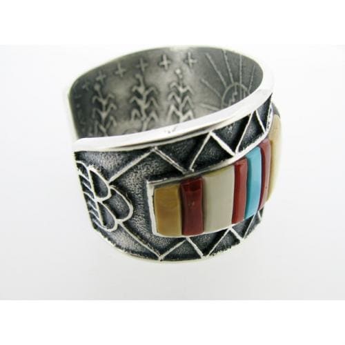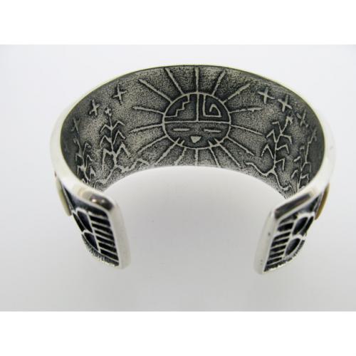 彼のジュエリーの裏面は、こちらもすべてトゥファキャストによって925(シルバーの純度)、Wikiviya(彼のHopiネーム)と彼の氏族である太陽が刻まれ、表は黒っぽい燻し仕上げ、裏はホワイトできらっとした仕上げ、と見えないところまで非常に手が込んでいます。美しい磨きがかかった彼の作品、日本ではほとんど出回っていません