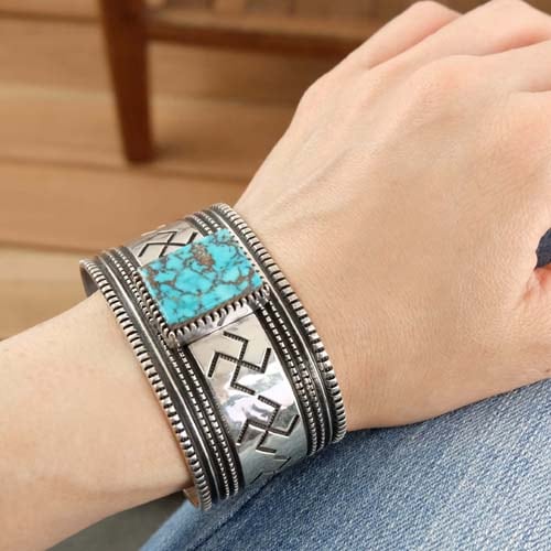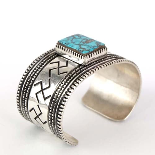 矩形のターコイズが、インディアンジュエリーに知性と品格のエッセンスを加えてくれています。