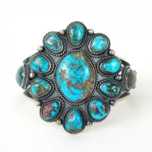 アリゾナ州にあるビズビーでとれるターコイズ。ビズビーも銅山で、ターコイズが発見されたのは6キロも深い地下だったそうです。そこからとれた石は深い紺?黒に近いような青色に茶色?黒のマトリックスが入っており、色が非常に特徴的で人気のあるターコイズの一つになっています。中でも、曇っているように見えるマトリックスが入っているものはスモーキービズビーやラベンダーなどと呼ばれ、コレクターアイテムの一つとなっています。青色が濃く、その中から染み出しているようなマトリックスが入っているものが人気が高く、高価になります。