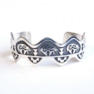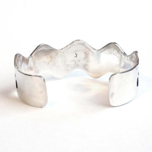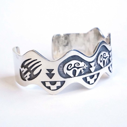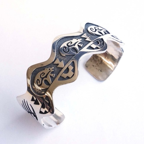 ホピ族Louis Josytewaのオーバーレイの珍しい形のバングルです。