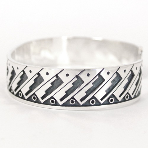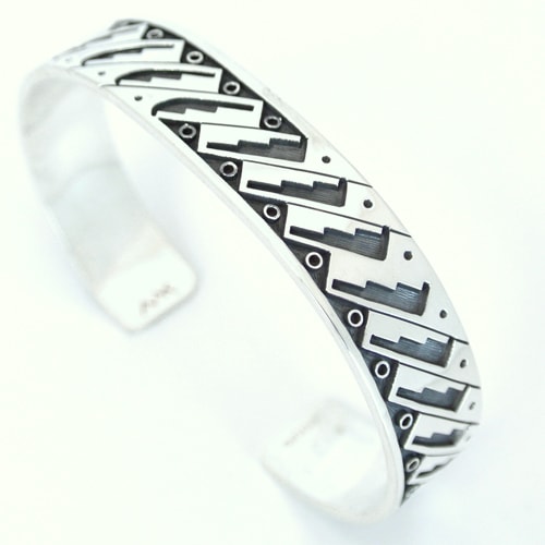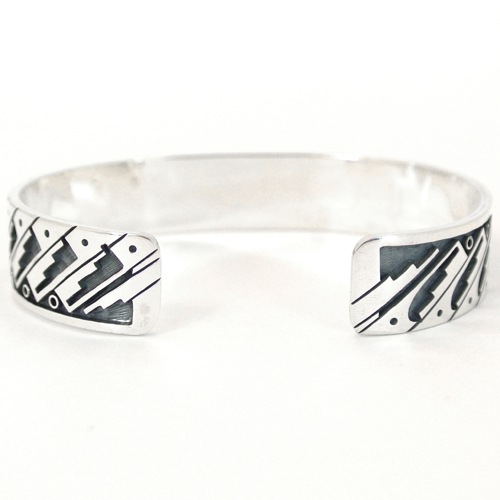 ホピ族マーサスコインバのバングルです。中心からエンドまで定番の「Water running=水の流れ」モチーフの連続柄ですが、カッティングの正確さとシャープなラインに脱帽。伝統を一歩抜けた洒脱なジュエリーに仕上がっています。デザインと技術のレベルの高さで他アーティストからも一目置かれているマーサスの、細かい技と情熱が伝わってくる作品です。