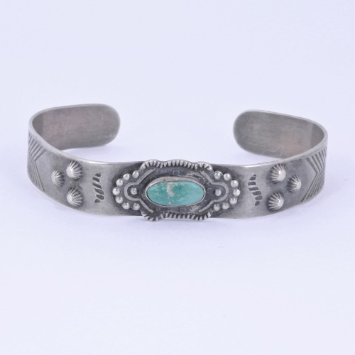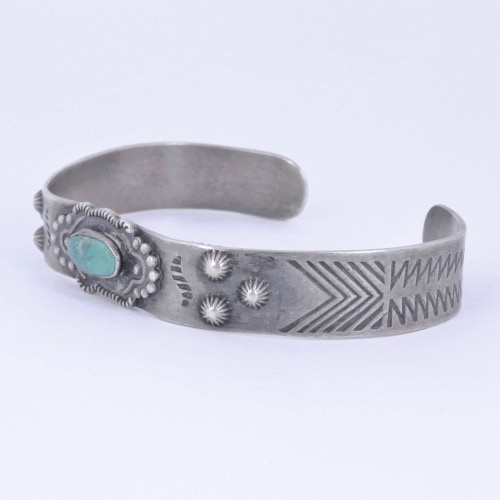 その状況に目をつけたのが「フレッドハービー社」になります。1876年、彼らは当時簡単に済まされていた車内の食堂をグレードアップさせ、鉄道沿いにレストランをオープンさせました。中西部から西海岸と広範囲に渡り、統一した質のよいサービスをするのは当時にしたらとても斬新な事でした。制服を着て、質のよいサービスをするフレッドハービー社のウェイトレスは『Harvey Girl』として評判になり、時代を現すものとして1946年には映画が出来たくらいです。順調に経営を広げていったフレッドハービー社が次に目をつけたのが、現地のインディアンジュエリーをお土産として販売する事でした。ですが当時のものはあまりにも大ぶりで一般的なデザインではありませんでした。観光客がお土産に出来るものに…そこで、 より軽量で、より華奢で分かりやすいデザインし、それを現地のコマーシャル商品として売り出しました。それが見事流行り、フレッドハービー社がコマーシャルジュエリーを最初に始めた事から、こうしたジュエリーを『フレッド・ハービースタイル』と呼ぶようになりました。材料も道具も今のように充実していなかった時代、インディアン達はこのようなジュエリーを、当時の銀貨や銀食器から作っていました。一世を風びしたフレッドハービー社も、自動車の普及と共に倒産に追い込まれてしまいました。ですが、現在も売却されたホテルなどは残り、愛され続けており、ジュエリーもまた、コレクターの間では根強い人気があります。あのラルフローレン氏もその一人!時代と共にあったジュエリー、当時の歴史を感じられる一品です