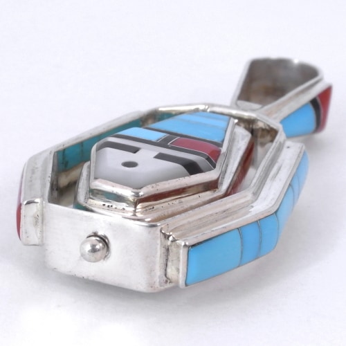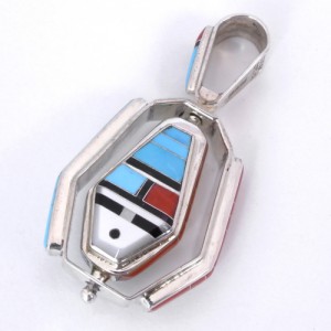 サンフェイスが回る、スピナーデザインと呼ばれるスタイルで人気のズニ族アーティスト、ドンデワ。インレイの細かさと美しさ、表面の滑らかな加工、そのデザイン性はジュエリーショーで数々の賞を受賞しており、世界中にファンがいます。