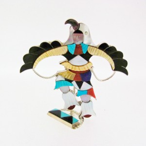 ズニ族Jonathan Beyuka作、美しい表面仕上げのイーグルダンサーカチナのスタンド&ピンペンダントです。鷹の羽をつけ、マスクをつけて踊るズニのダンサーをあらわしています。