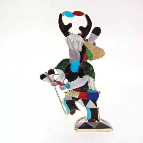 ズニ族Jonathan Beyuka作、美しい表面仕上げのディアダンサーカチナのスタンド&ピンペンダントです。杖を突き、鹿の角をつけて踊るダンサーです。