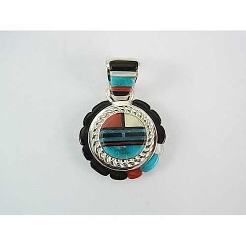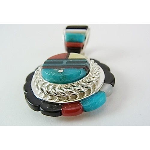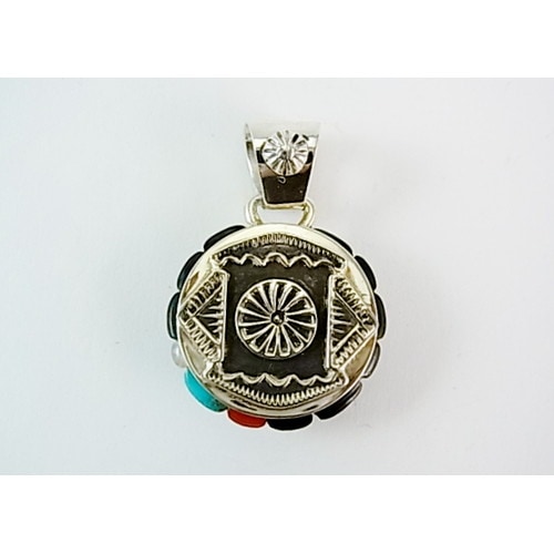 外側のインレイ、真中のシルバーワーク、トップのインレイと3層になった細かい細工のペンダント。バチカン部分のインレイもウィルバートならではの細工です。
