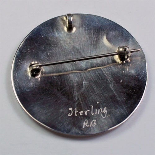 ズニ族のフラットインレイピンペンダントです。カットした銀板にターコイズやシェルを象嵌し、ズニ村近辺に住むカケスの仲間『ブルージェイ』が描かれています。周囲にぐるりと打たれたスタンプワークもいい雰囲気。裏面にはRBというスクラッチ刻印が書かれていて、作風としてはフラットインレイの先駆者、ズニ族のRaymond Boydのデザインと酷似しています。通常レイモンド作品はRAYMOND BOYDとゴシック体で刻印されるのですが、インレイを完成させてしまうと打刻できなくなるため、本人があとからイニシャルだけを書き入れた可能性もあります。
