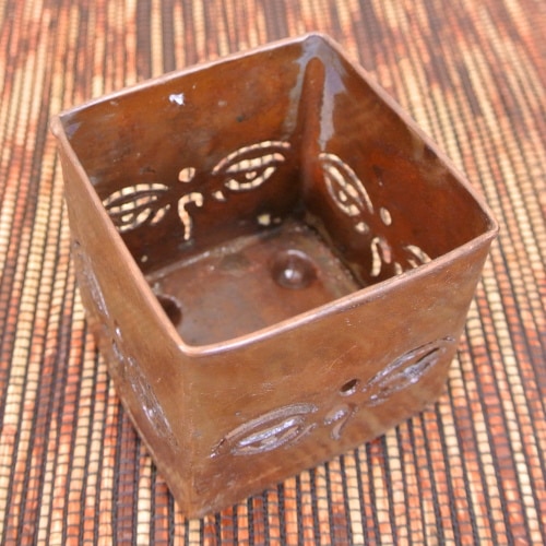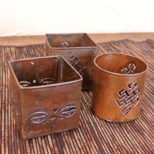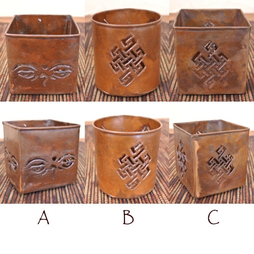 アンティーク風な色味のキャンドルスタンド!透かし細工のブッダアイ・エンドレスノットのデザインからこぼれる温かみのある火の明かりが癒しの空間を演出。