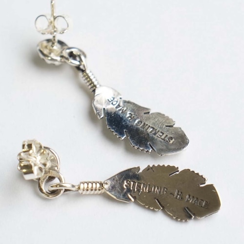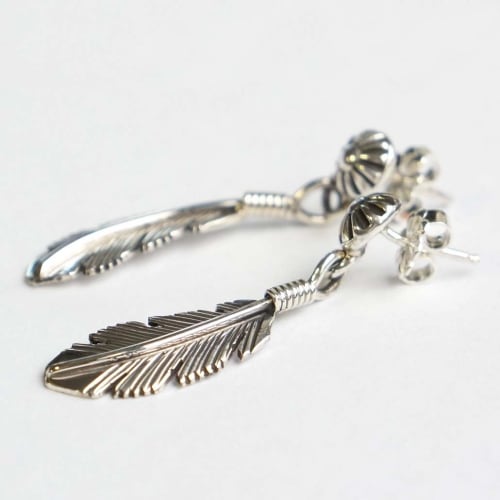 ハーヴィー・メイスのイーグルフェザーピアスです。細かい羽の一本一本までハンドメイドで刻まれています。 ネイティブアメリカンにとって、イーグルは神のメッセンジャーとされており、儀式の際にはイーグルフェザーは欠かせないアイテムです。 お守りとしてギフトにもオススメです。