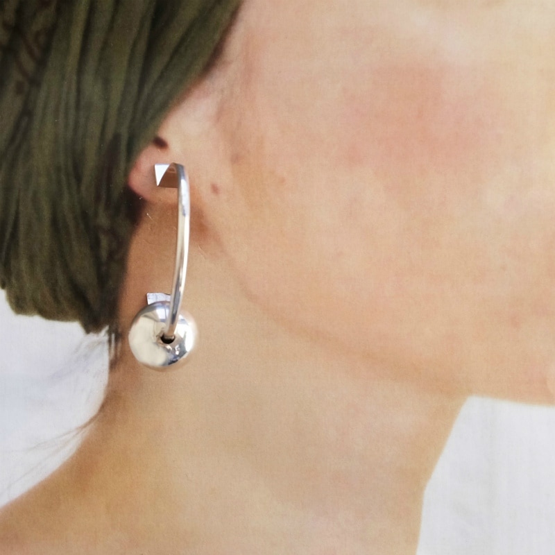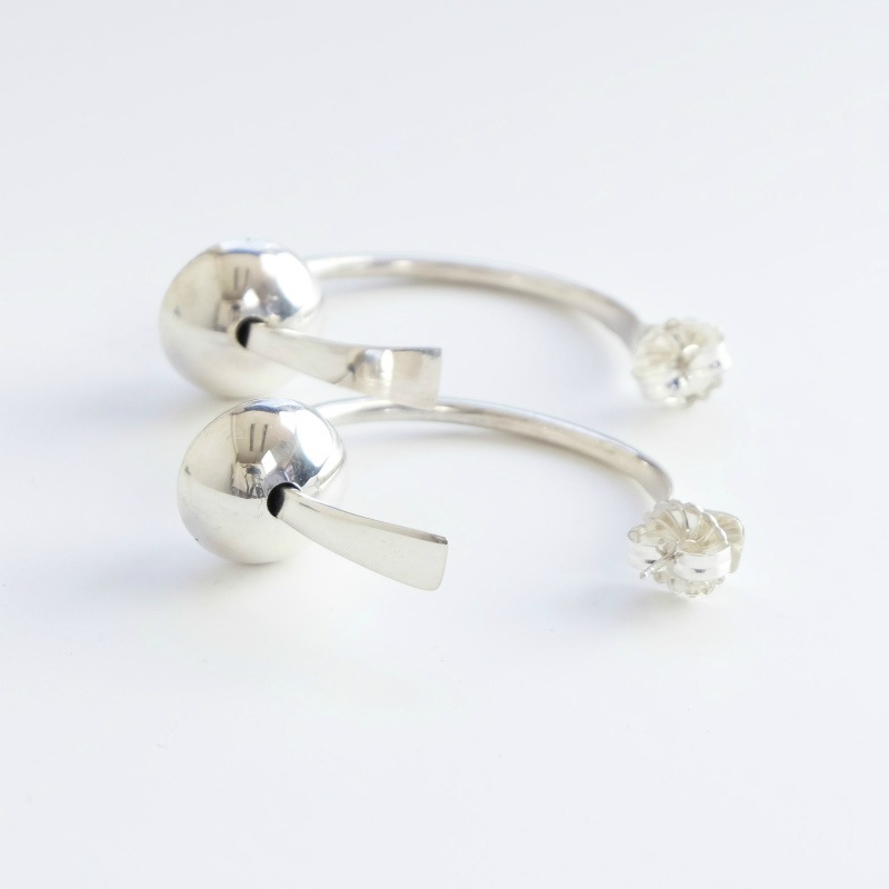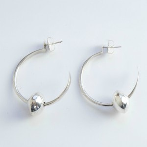 エディソンカミングズのフープピアスです。中空のハンドメイドフープに伝統的なハンドメイドシルバービーズを通しています。古いジュエリーを想起させるモチーフを現代的なフープピアスと大胆に組み合わせたオールドモダンなジュエリーです。