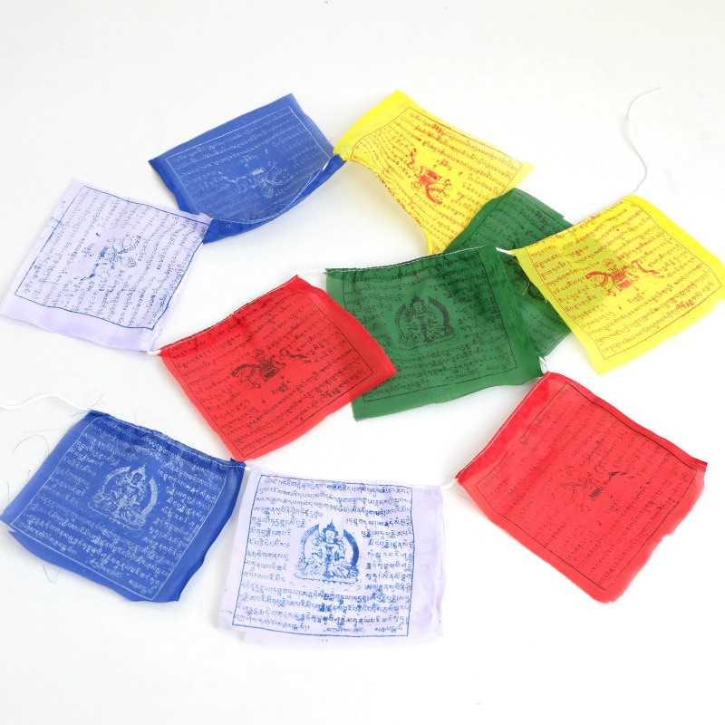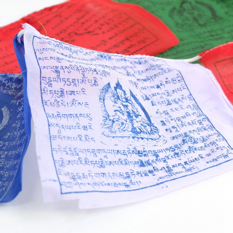 タルチョーは5色からなるチベットの祈祷旗です。色の順番は青・白・赤・緑・黄と決まっていてそれぞれの色が空・風・火・水・地というあらゆる世界を構成するとされる5要素を表しています。馬が描かれたものはルンタ(風馬旗)とも呼ばれ、風に乗って仏法が広がるよう願いが込められているそうです。また、旗にお経がかかれているものは風にたなびくたびにお経を唱えたことになるということです。マライカで扱っているタルチョーはネパールのポリエステル生地の物でそれぞれにお経と風馬もしくはアミタバ(阿弥陀)が木版により描かれています。青~黄が2連となった10旗のものとなります。