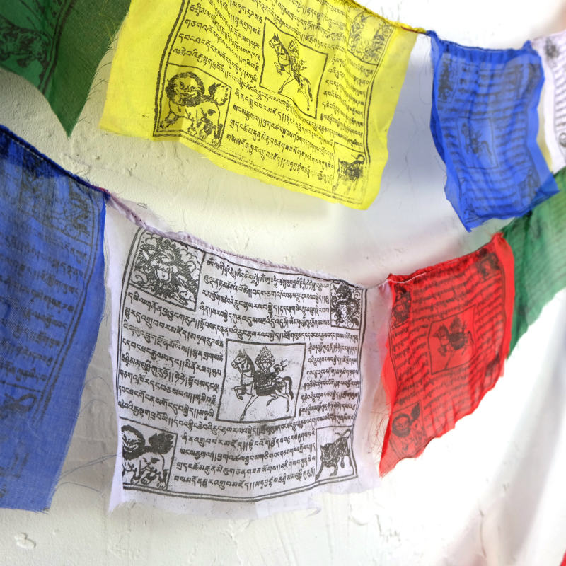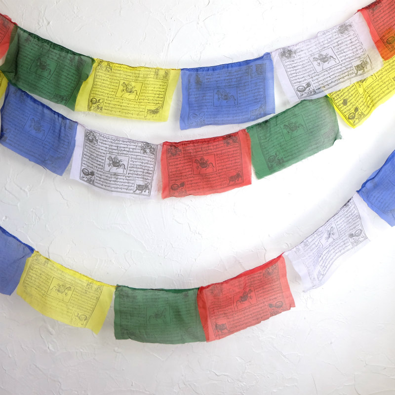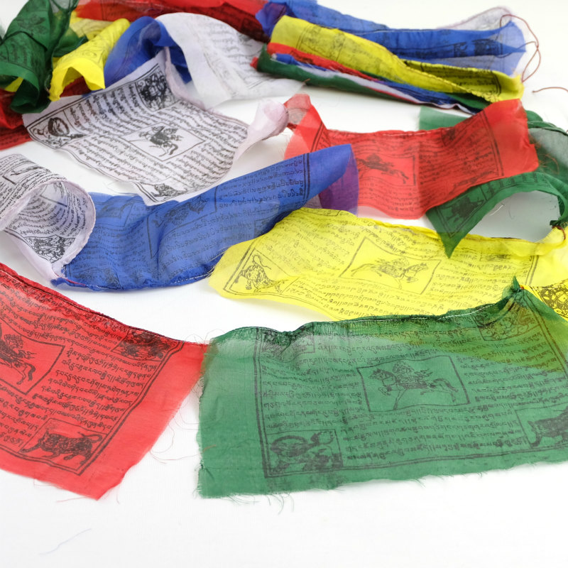 タルチョーは5色からなるチベットの祈祷旗です。色の順番は青・白・赤・緑・黄と決まっていてそれぞれの色が空・風・火・水・地というあらゆる世界を構成するとされる5要素を表しています。馬が描かれたものはルンタ(風馬旗)とも呼ばれ、風に乗って仏法が広がるよう願いが込められているそうです。また、旗にお経がかかれているものは風にたなびくたびにお経を唱えたことになるということです。マライカで扱っているタルチョーはネパールのポリエステル生地の物でそれぞれ旗の中心に風馬と四隅に4神とお経が木版により描かれています。青~黄が5連となった25旗のものとなります。