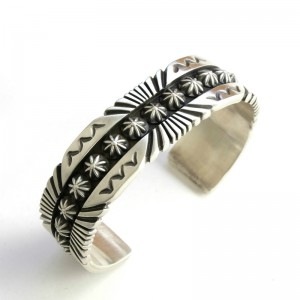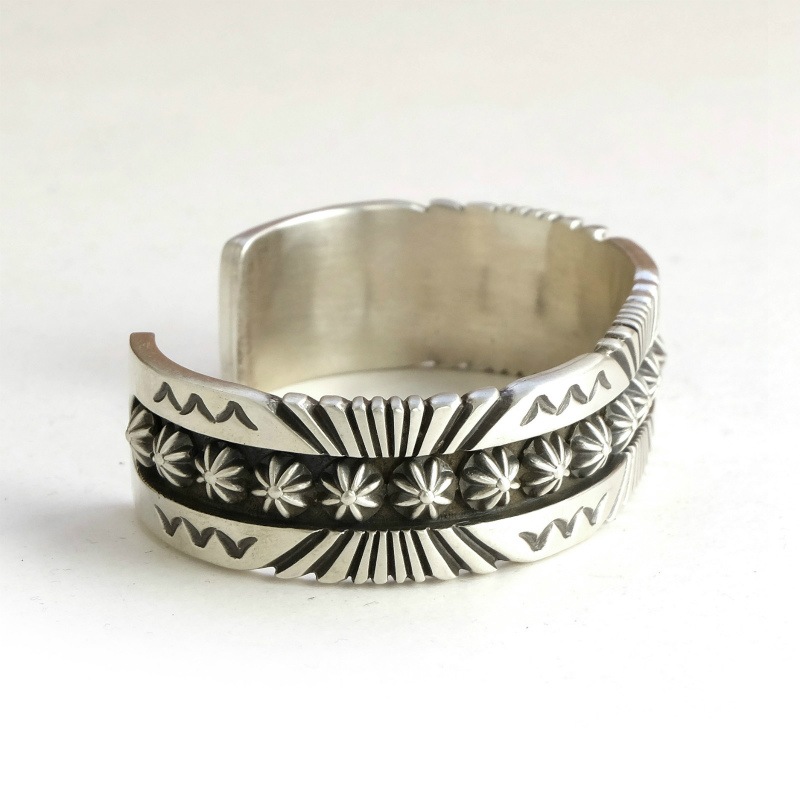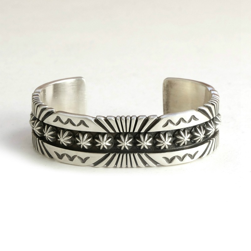 1955年アリゾナ州に生まれ、1970年代後半からジュエリー製作を始めたトーマスジム。 Ronnie Bedonie、Pat Bedonieとも血縁があり、Wilson Jimを兄弟に持つトーマスは、家族の影響でシルバー製作を始めました。ヘビーゲージのシルバーを使ったオールドスタイルを貫く彼の作品は、様々な賞を獲得し、今では数少なくなった本当のオールドスタイルのスタンプワークが感じられるものばかりです。