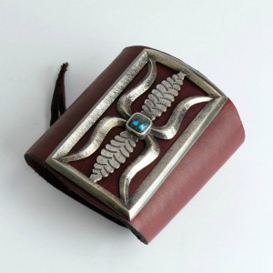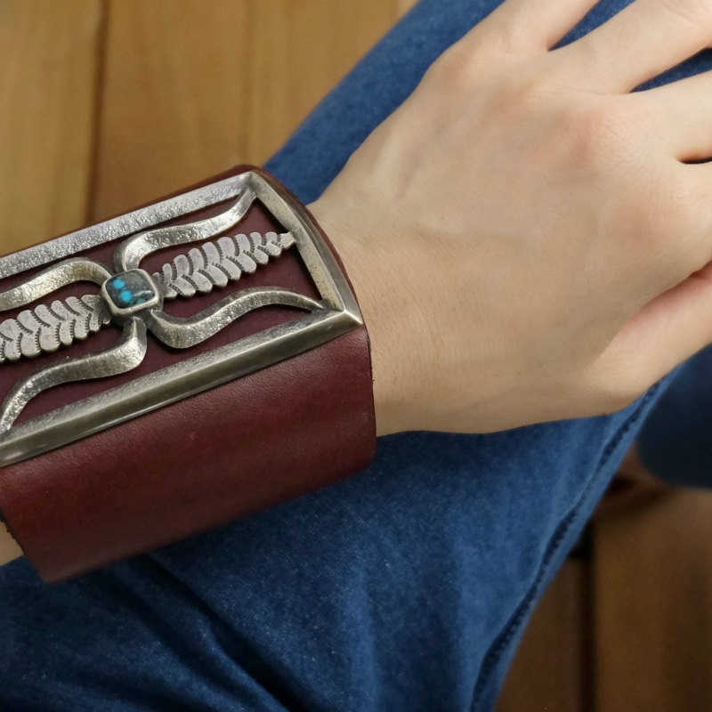 名工Darryl Begayの、ローンマウンテンを使用したボウガードです。ボウガードはケトー(ケイト)とも呼ばれ、元々は弓を射る際に弦が腕に当たって怪我をするのを防ぐための装備。そこから身を護るお守りとしての意味が加わり、今でもサウスウエストのネイティブアメリカンの儀式やダンスの際にはボウガードを身に着けることがよくあります(木彫りのカチナの腕に良く身に着けられています)。こちらはトゥファキャストで作られたオールドポーンのような表情の1点。中心にはハイグレードのローンマウンテンがあしらわれています。モダンで洗練されたジュエリーを多く作るダリルの、原点に戻ったようなオールドスタイルのジュエリー、インパクト絶大のジュエリーです。