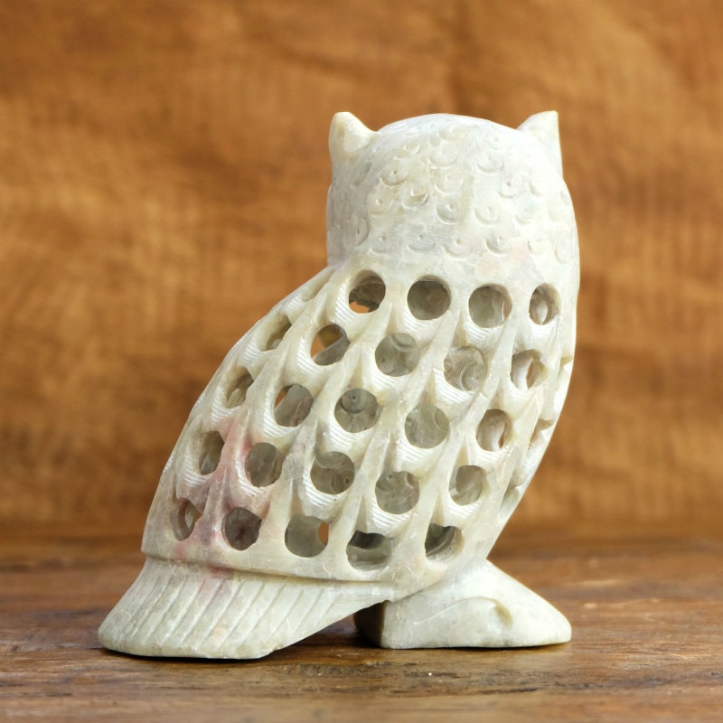 インドでは古くより彫刻が行われています。この商品はソープストーンに繊細な細工が施された彫刻象です。よく見ると透かし彫りされた中にもう一匹ふくろうが彫られています。