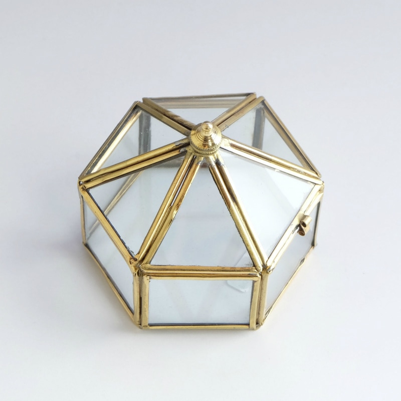 大人気の六角ガラスボックス、高さのある物も入れやすい立体バージョン。インテリアのディスプレイケースや小物入れ、ジュエリーケースやリングピローなどとして工夫次第で色々お楽しみいただけます。