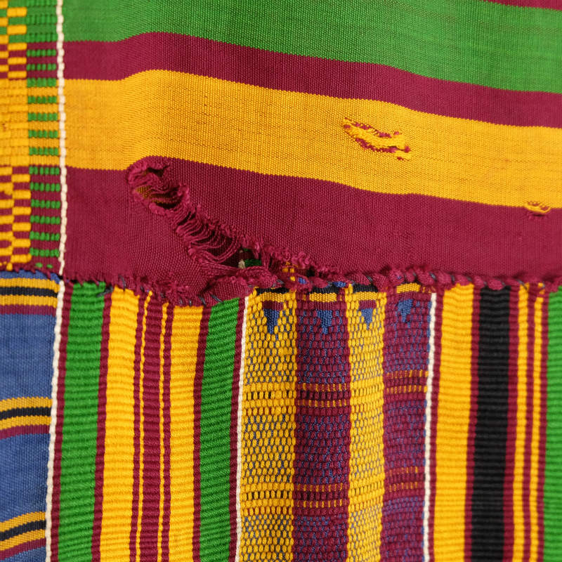 ケンテクロスは、現在のガーナ共和国に居住するアシャンティ族やエウェ族の伝統工芸による民族衣装です。ケンテの織工は今も水平機と呼ばれる織機を使い、その手織りが受け継がれています。この水平機は10~15cm程度の幅までしか織ることができないめ、帯状に織り上げた布を横に16~24枚縫い合わせて一枚の大きな布にしています。男性は200cm以上もの長さのケンテクロスを体に巻きつけるように纏い、女性は一対で作られた小さめのものを巻きスカートとトップスのようにセットアップで着用します。