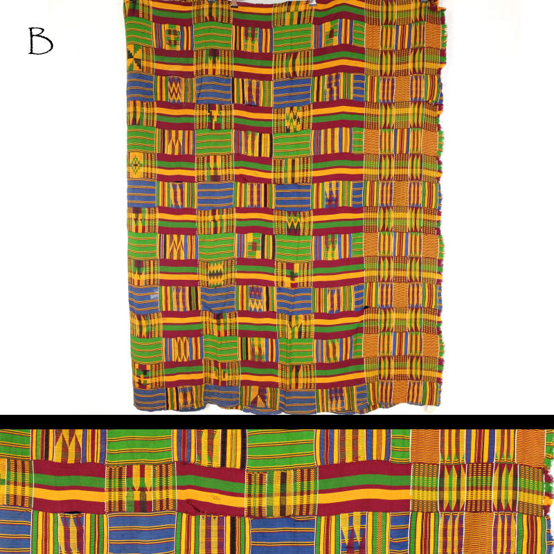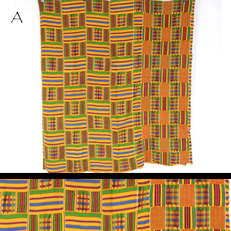 アシャンテ族伝統の民族衣装ケンテクロス。平織り、畝織り、両面縫取織りの技法で、様々な織り模様をブロック状に織り上げた細幅布です。これを規則的に接ぎ合わせて大きな一枚の布にしています。ケンテクロスとしては小さめなので、タペストリーやソファーカバー、ベッドスロー等、日常的に楽むことができるサイズです。
