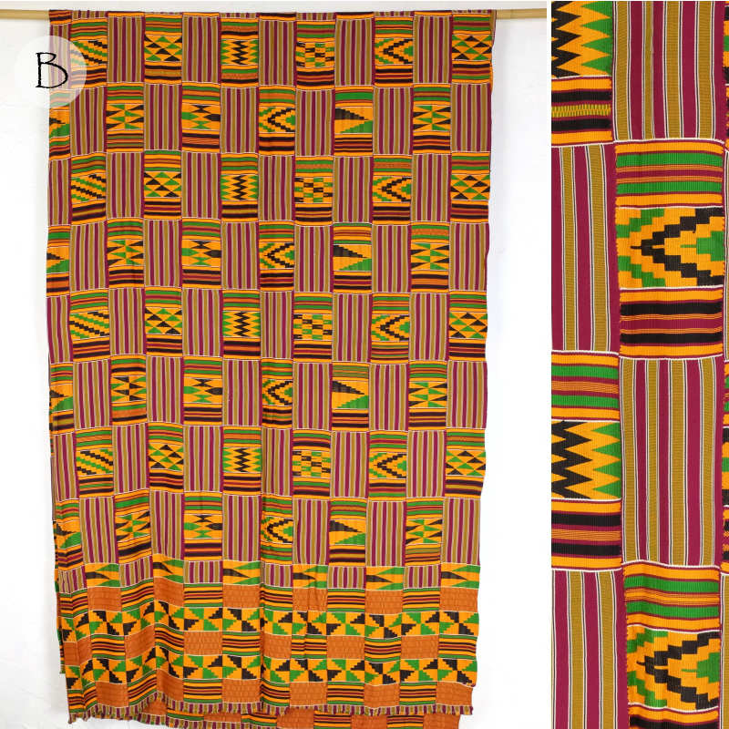 アシャンテ族伝統の民族衣装ケンテクロス。平織り、畝織り、両面縫取織りの技法で、様々な織り模様をブロック状に織り上げた細幅布です。これを規則的に接ぎ合わせて大きな一枚の布にしています。身に纏うことができる王道サイズのケンテです。ずっしりとした重量感があります。