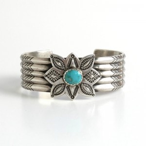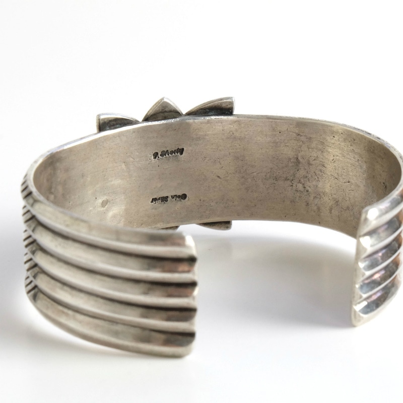 ペリーショーティ―はニューメキシコ州生まれでナバホ族です。22歳からジュエリー作りを始め、とても有名な話ですが古い銀貨を使用した伝統的な技法が特徴です。彼の使用する銀貨は1890年-1915年にその当時の造幣局の彫刻部長チャールズ・E・バーバーによってデザインされたBarber Coinsと呼ばれるコインを使用しています。製作工程は、溶かした銀貨をトーファと呼ばれる硬い石の中に流し込み、熱い状態のままハンマーで叩きながらシルバーの厚みなどを決めていきます。その後スタンプを施します。 彼が銀貨を使用した作品には「Coin Silver」と刻印されています。昔のジュエラーのように最低限の道具だけを使用し、せかせかせずにひとつひとつ丁寧に時間をかけて作り上げる作風も彼のこだわりです。年に3回しかショーに出展しないらしく、彼のブースの前には夜中から列が出来るほど世界中に多くのコレクターを持つとても有名でレアなジュエラーです。ショーの開始時間にはすでに売り切れるほどで、運良く彼の作品に触れる機会があっても一人1点しか購入できません。彼がブースで奥さんと小さいお子さんと一緒に居る姿はとても穏やかな雰囲気でした。家族との時間をとても大事にし、ゆっくりと落ち着いた口調であまり多くを語らない彼は生粋の職人といった感じですが、時折見せる笑顔がとても優しい印象でした。