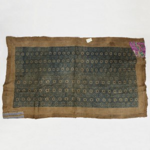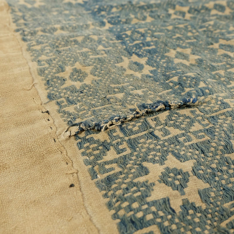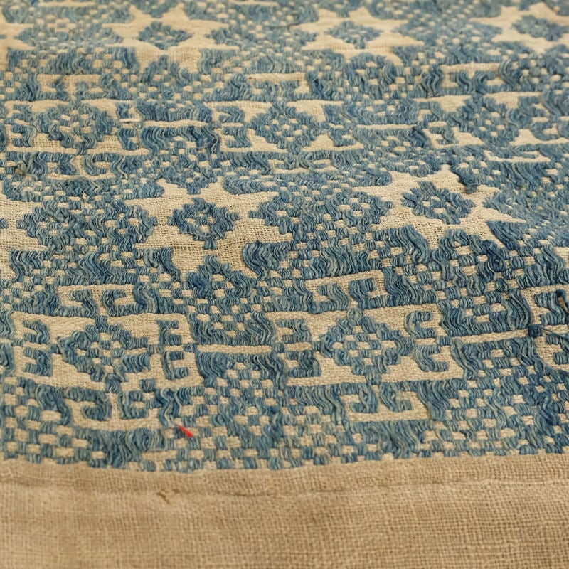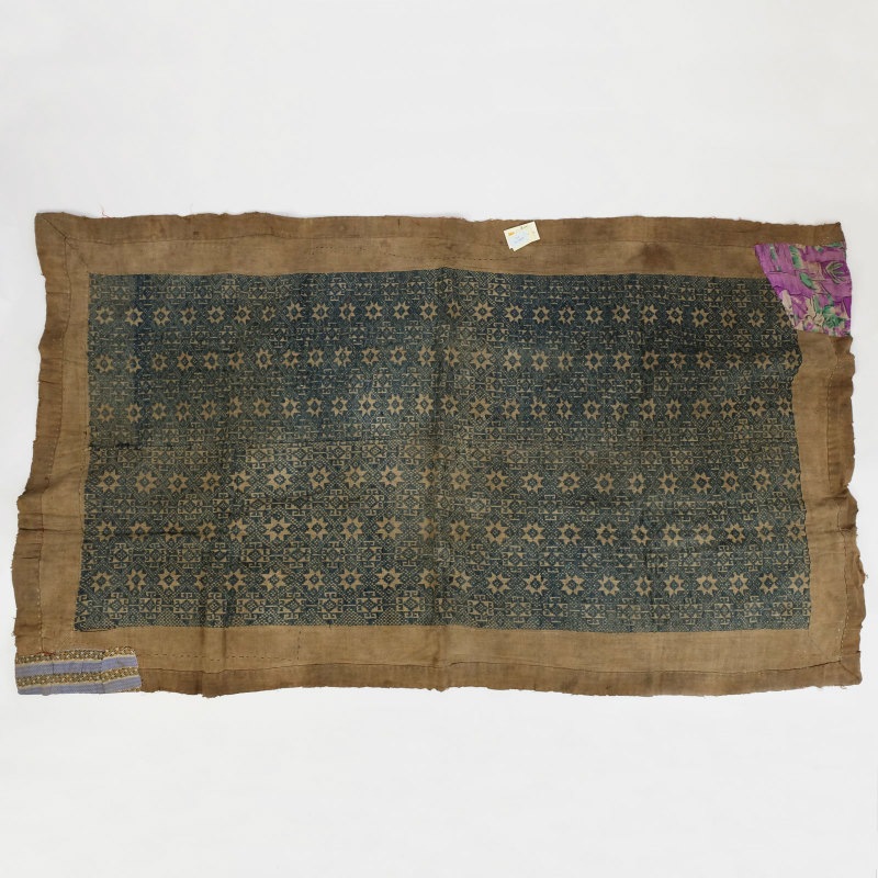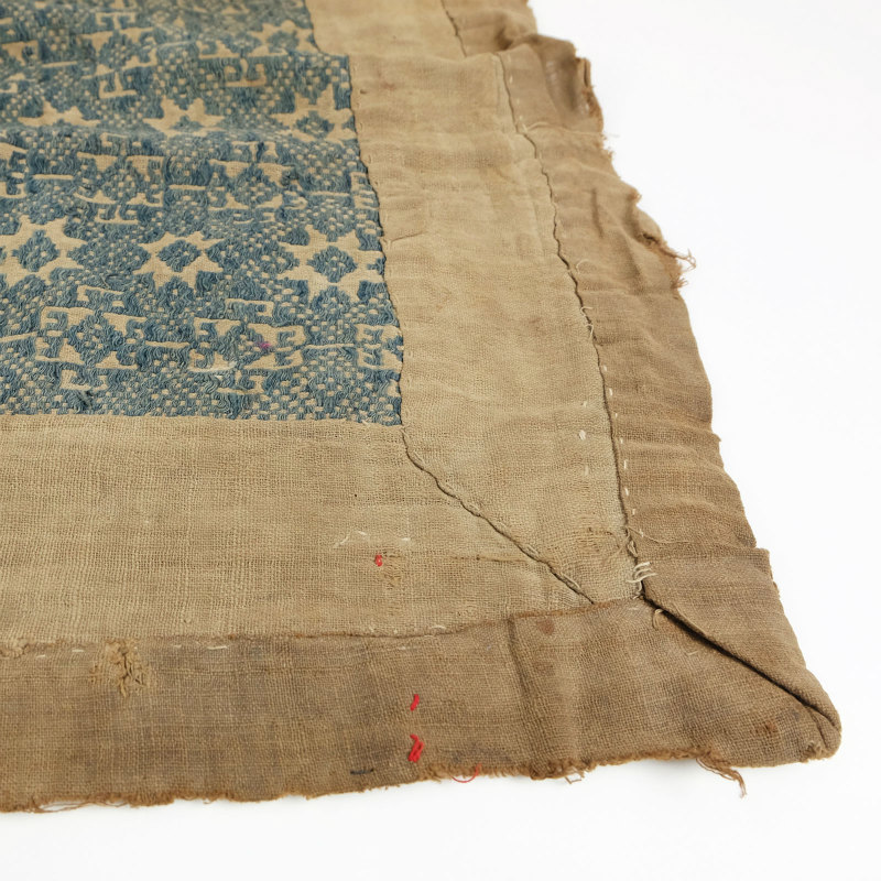 タイ・デーン族による手織りの敷き布、“パーホム”。パーホムは寺院や旅先などで簡易寝具(ブランケット)として使用される多目的布です。藍染めの手紡ぎ糸による織り布を2枚はぎにし、回りを無地の手紡ぎ手織り布で囲んであります。裏側は使用による摩擦や力が加わる為にダメージがありますが、当て布をして繕った部分が随所に見られ、いかに大事に使われてきたかが伝わってきます。紋様織り部分の痛みは経年を感じさせるものの、裏側の補修に比べると色あせ程度で、元々の織りの質の高さを読み取ることができます。