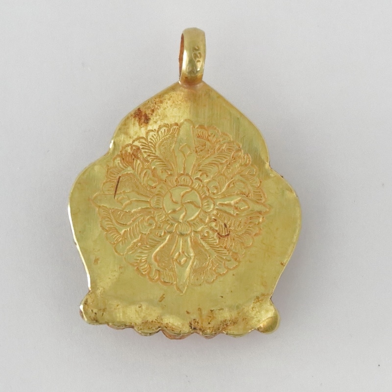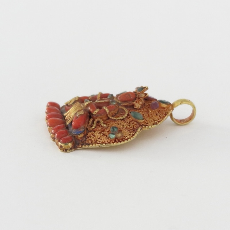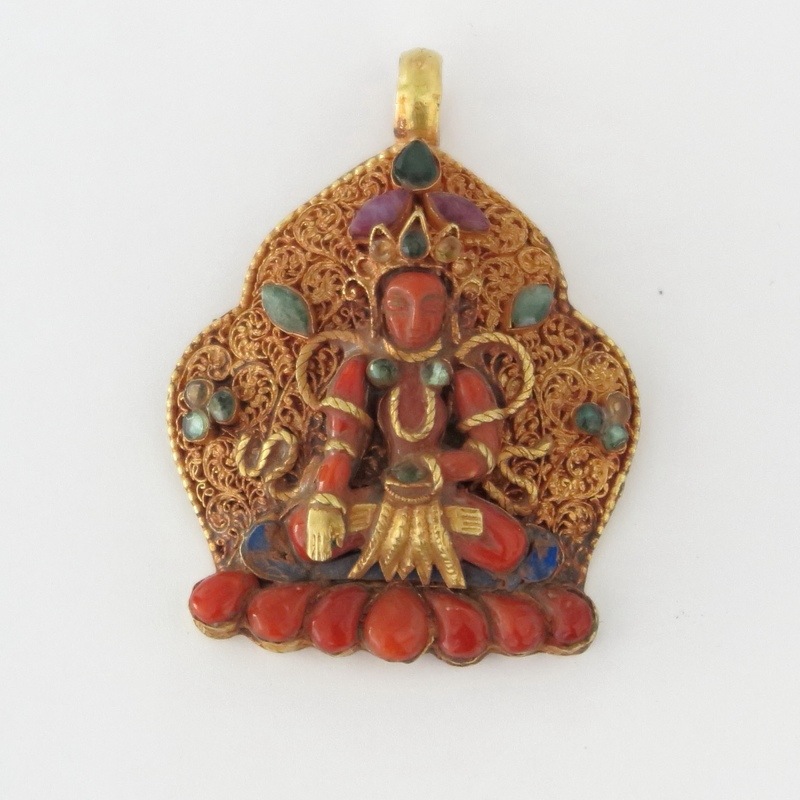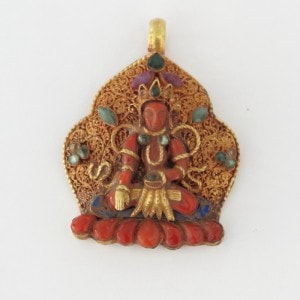 ネパールのパタンで作られた精巧なゴールドペンダントです。コーラルで象られた多羅菩薩やエメラルドの装飾などが施された豪華なペンダントです。1900年頃にお守り用として使用されていたものではないかと推測されます。