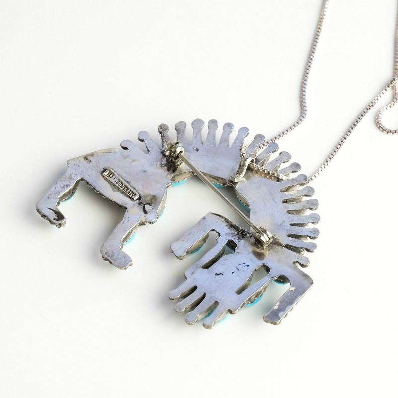 ズニ族Hugh Bowekatyのニードルポイントピンペンダントです。一粒一粒美しい弧を描くように磨かれたスリーピングビューティーでズニ族のレインボーマンのモチーフを描いています。レインボーマンはその名の通り虹の体を持つズニの古い楯などに描かれたモチーフ。「守護の力」や「調和」を意味し、争いを好まないズニ族らしいモチーフです。継承者が少なく今後ますます希少になってゆくだろうニードルポイントの傑作ジュエリーです。