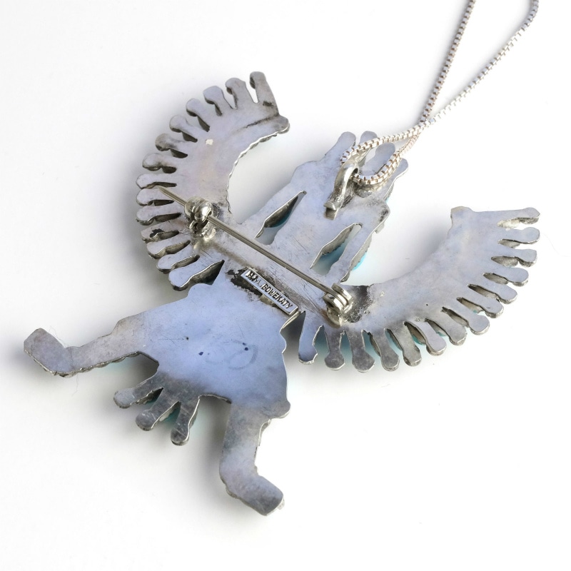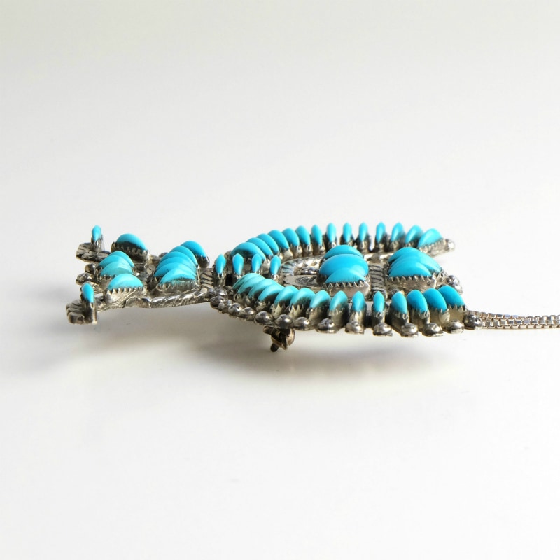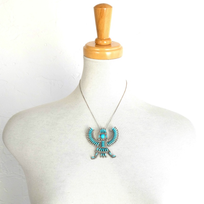 ズニ族Hugh Bowekatyのニードルポイントピンペンダントです。一粒一粒美しい弧を描くように磨かれたスリーピングビューティーでズニ族のナイフウイングのモチーフを描いています。トップには半身は人間、半身はイーグルの姿をしたズニ族の戦いの精霊ナイフウイングが。継承者が少なく今後ますます希少になってゆくだろうニードルポイントの傑作ジュエリーです。