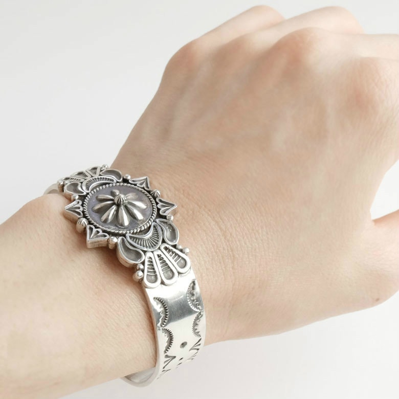 トーマスジムのスタンプワークバングルです。スタンプしたパーツを丁寧に貼り付けたアップリケスタイル。重厚な作品が多いトーマスジム作品の中で軽めのつくりです。中心部分のロゼッタが印象的で華やかなクラシカルバングルです。