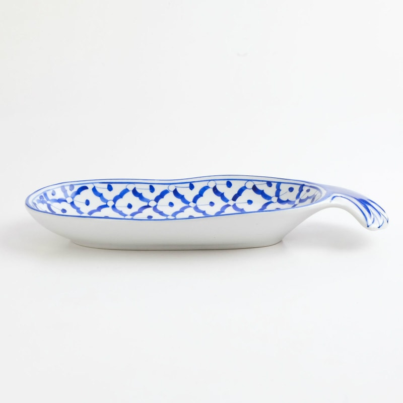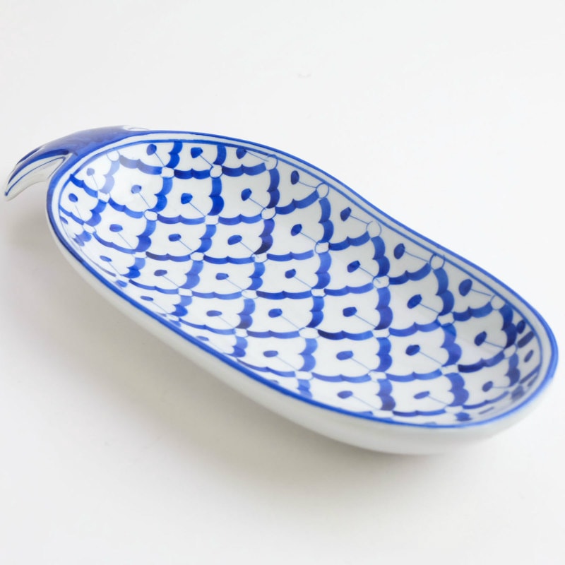 南国を思わせるエスニックテイストでユニークなデザイン。タイ伝統の青白陶器。ケーキやフルーツなどのスイーツを乗せたり、ちょっとしたおつまみの盛り付けにちょうどいいお皿。他には印象的なフルーツ型のお皿は、インテリアとしてお部屋に飾ってみてもいいかも。