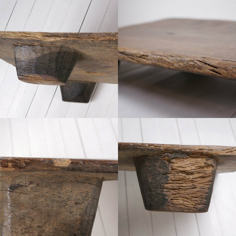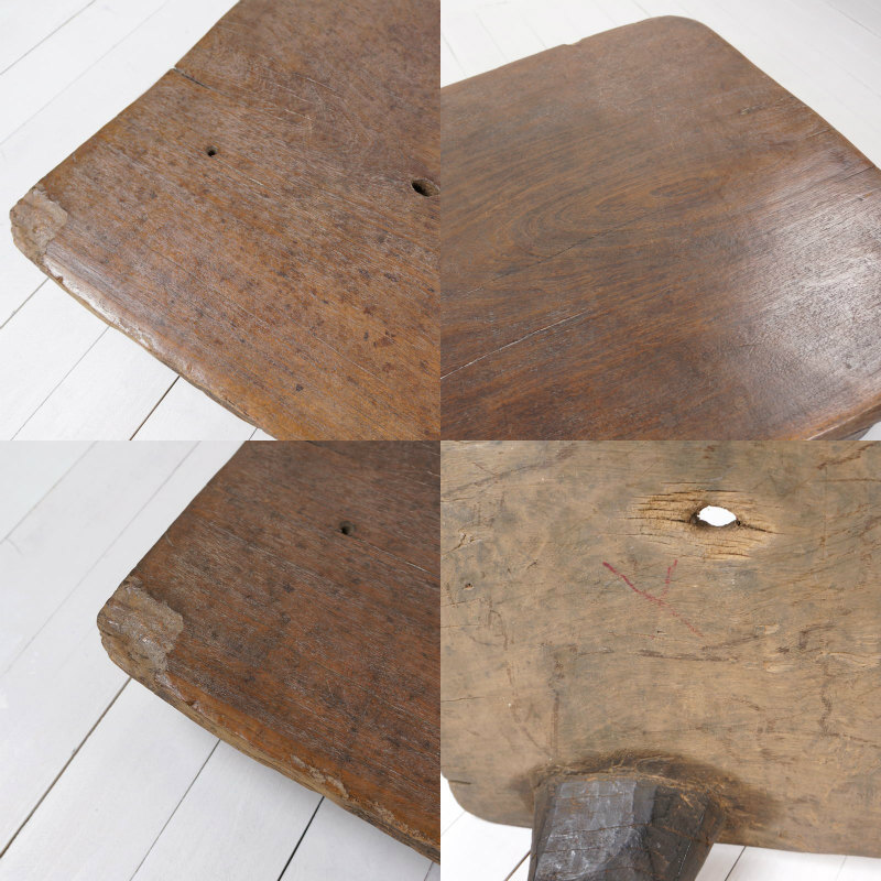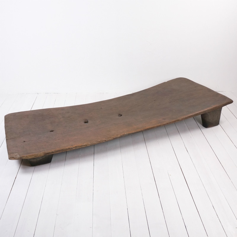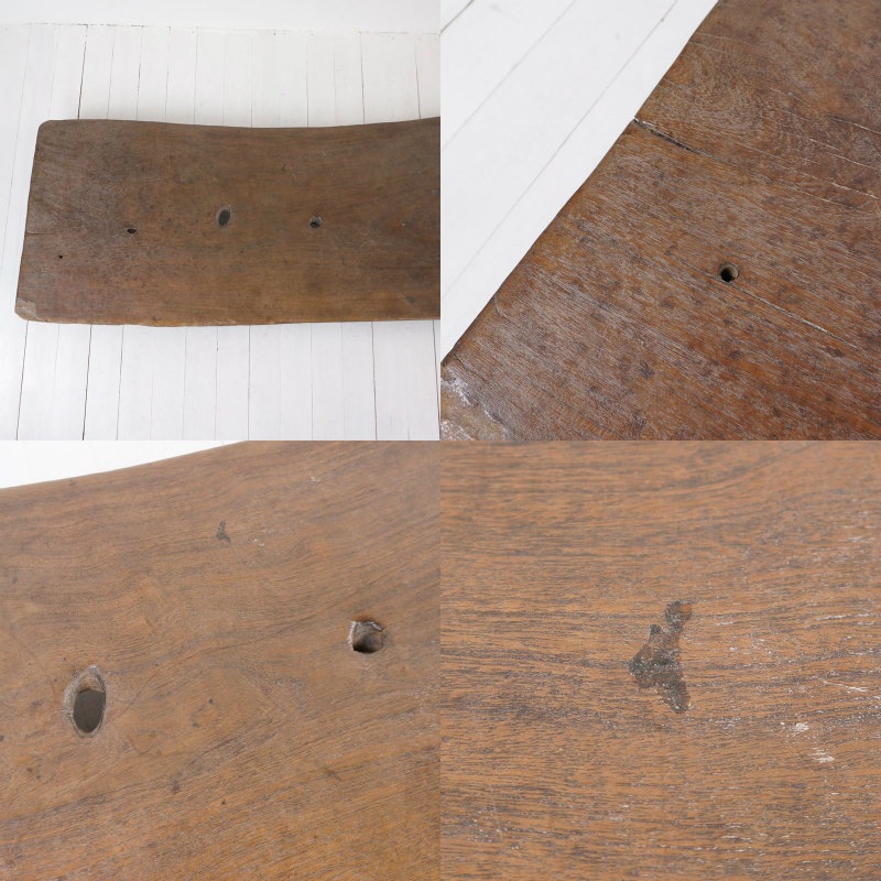 木目がきれいに入っているベッドです。 ベッドの末端から11~80cmの位置に大小4個の木の節を取り除いた跡とみられる穴がこちらにも開いておりそれが風景となっています。また、現地で使用中に出来たとみられるカケがベッドの末端角と先端より20cmほどの位置にございます。 また、ベッド末端付近とベッド脚部にキクイムシ痕、中心付近に樹脂と思われるものの付着が認められます。 また、使用中や輸送時に出来たとみられる擦り傷などがございます。ベンチやコーヒーテーブルとしてなど、個性あふれる家具としてお使いいただけます。
