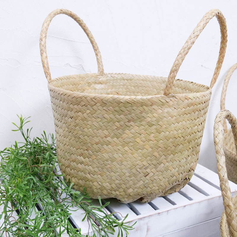 天然素材のシーグラスを使った取っ手付きバスケットのSサイズ。鉢カバーとしてやランドリーバスケット、小物やおもちゃ・ぬいぐるみなどの整理かご・ピクニックバスケットにも!Lサイズ、Mサイズのサイズ展開もしているので、用途によって使い分けても良さそう。