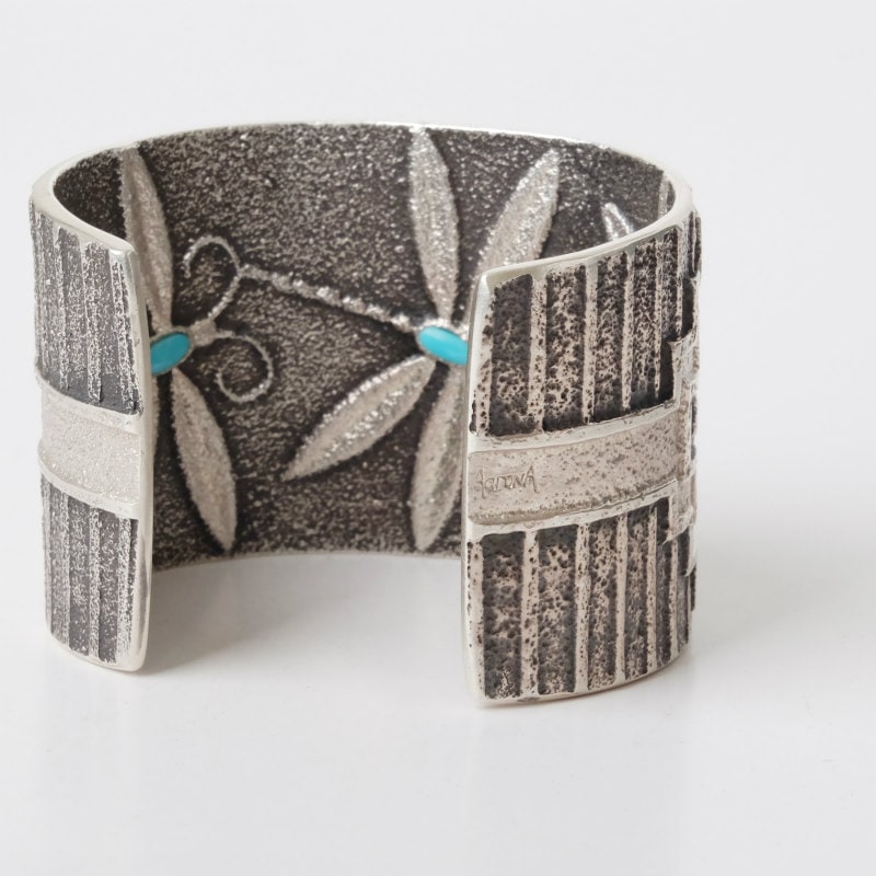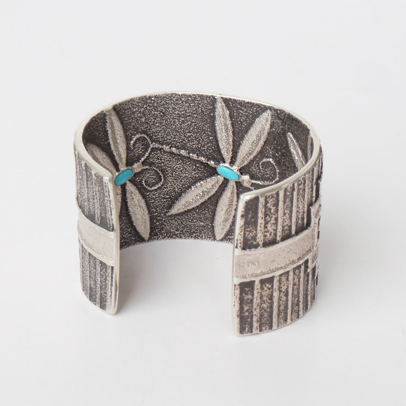 アーロンアンダーソンとダリルビゲイのトゥファキャスト2大アーティストのコラボバングル。表面はアーロンアンダーソンによるナバホラグデザインで、ダリルビゲイの質感に合わせた燻しとシルバーの色味の使い分けが非常に珍しいデザイン。裏面はダリルビゲイによる3匹のトンボのデザイン。一点もの、最高のコラボレーション作品です。
