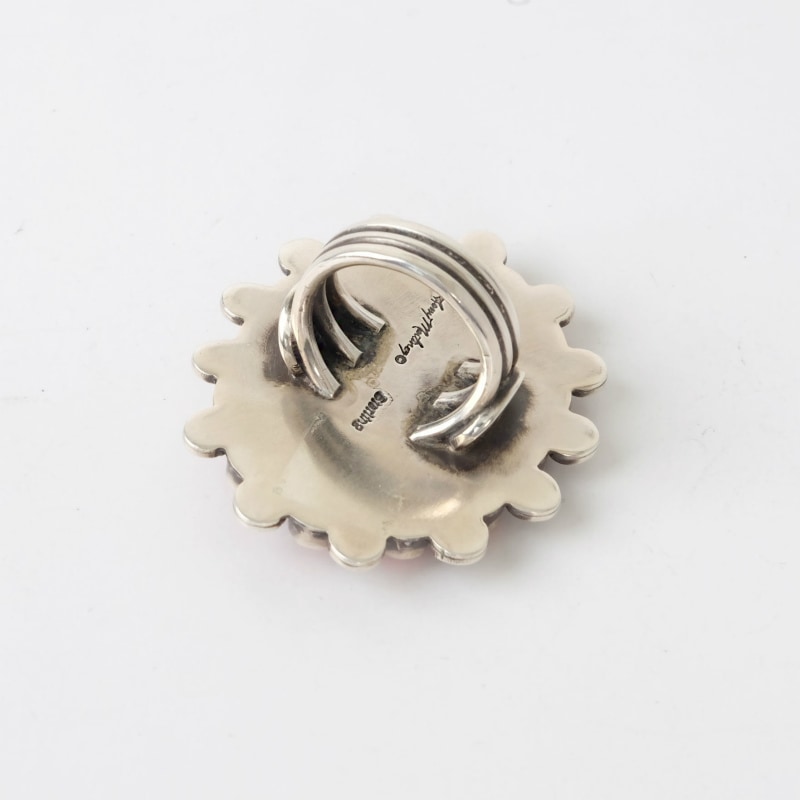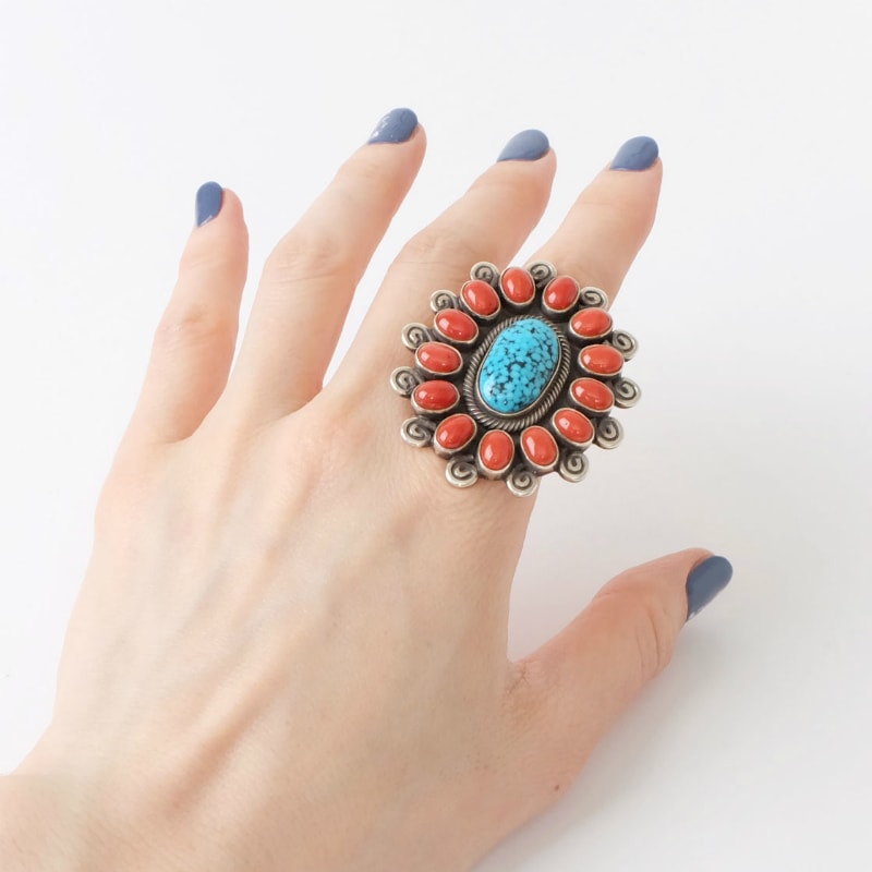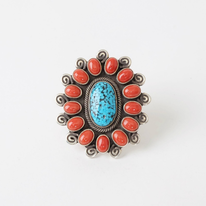 ナバホ族・テリーマルチネスのクラスターリングです。ブラックウェブキングマンとナチュラルサンゴを使用した豪華な作品。サンゴの周りにスパイラルをあしらってさらにボリュームを出した豪華な1点です。ナバホ族の女性たちに人気のあるクラスターを上質な石とシルバーワークで極めた美しいリングです。