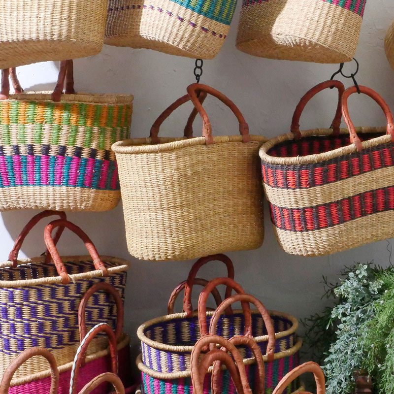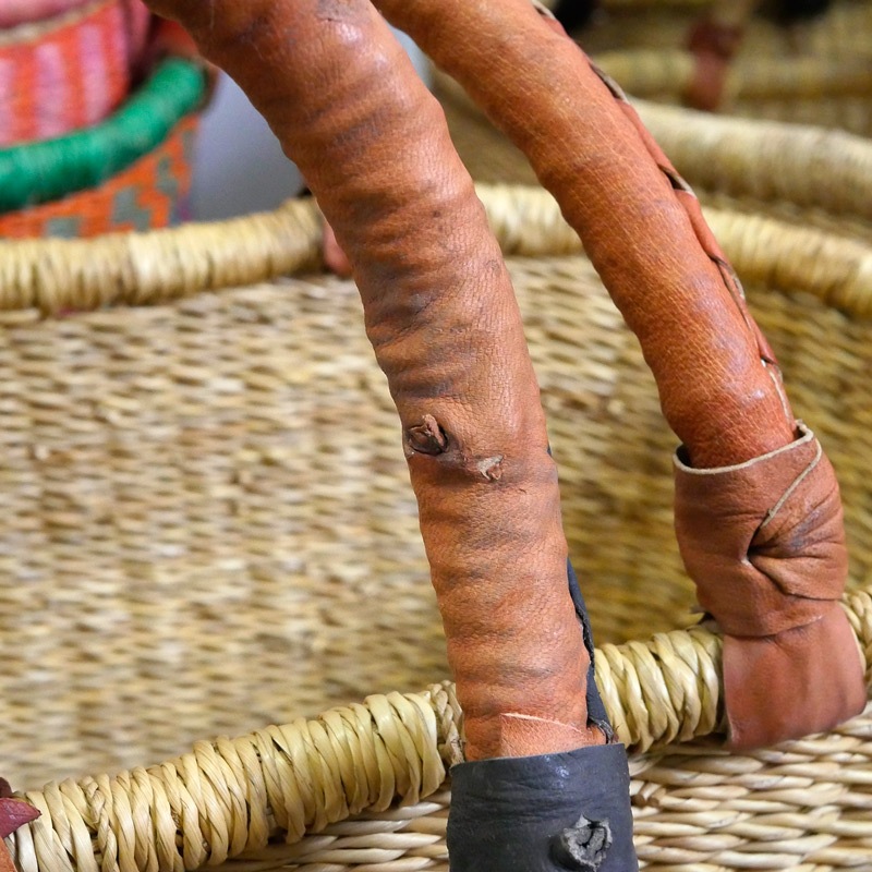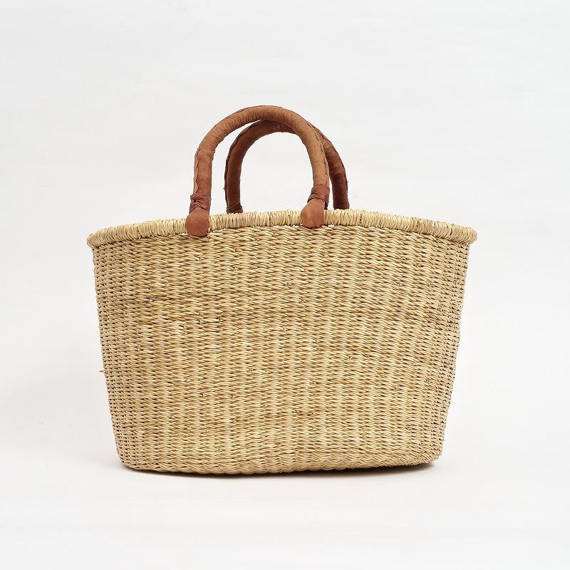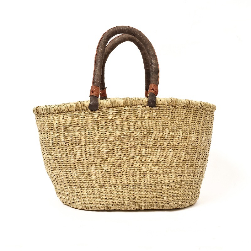 アフリカ・ガーナ北部の州都ボルガタンガで作られる『エレファントグラス』や『ベタベラグラス(VETA VERA GRASS)』と呼ばれる水草を編んで作られたバスケットです。別名「ボルガバスケット」とも呼ばれ世界的にも人気のあるバスケットです。ボルガタンガで編まれたバスケットは熟練したブルキナファソの革職人に送られ山羊革のハンドルを仕上げます。このことからブルキナバスケットと呼ばれます。 現地では、買い物など日常的に使われていて生活に欠かせないアイテムです。 『エレファントグラス』もしくは『ベタベラグラス』はイネ科の植物で、ロープなどにも用いられるほど丈夫な繊維です。製品は大変弾力性があり丈夫で長持ちします。もともとが水草なので汚れたら水で洗えるのもいいですね。