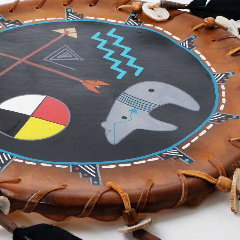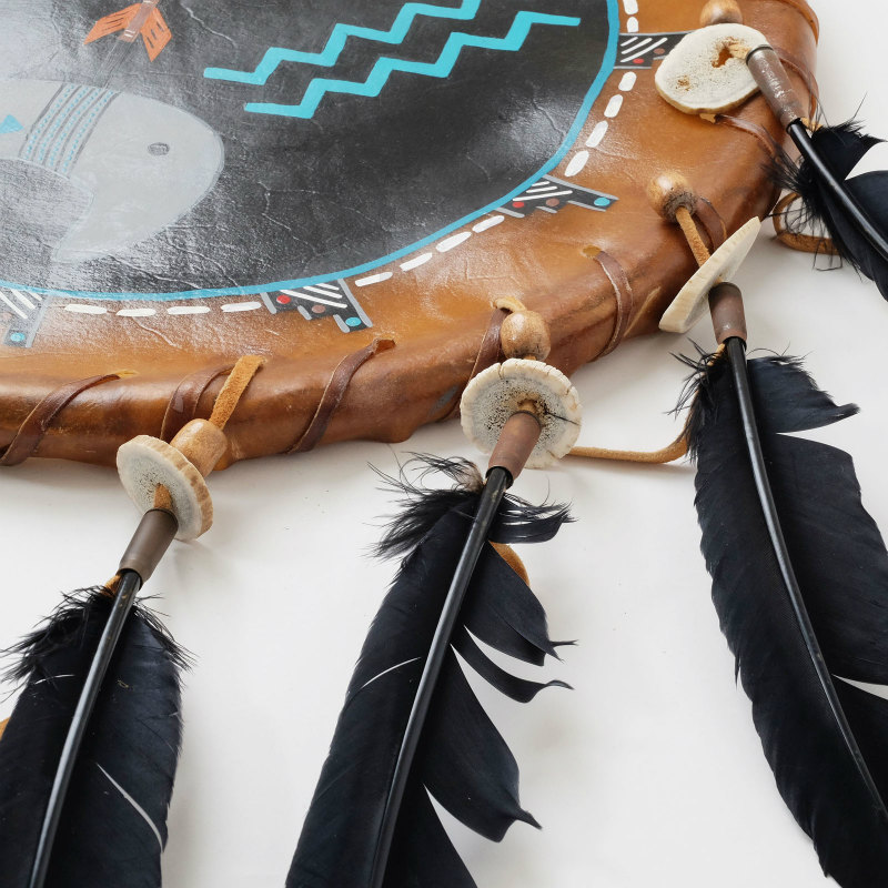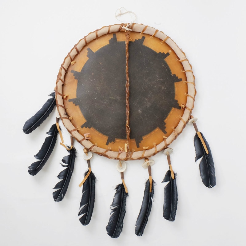 ネイティブアメリカン、ナバホ族アーティストにより作られるウォーシールド(盾)です。現代では戦闘に使われることは勿論ありませんが、ネイティブアメリカンによる伝統的な民芸品として作られています。表に伝統的な柄のペイントが施されていますので、インテリアに加えると雰囲気のあるお部屋作りが出来そうですね!