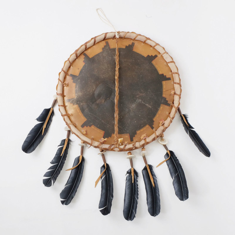 ネイティブアメリカン、ナバホ族アーティストにより作られるウォーシールド(盾)です。現代では戦闘に使われることは勿論ありませんが、ネイティブアメリカンによる伝統的な民芸品として作られています。表に伝統的な柄のペイントが施されていますので、インテリアに加えると雰囲気のあるお部屋作りが出来そうですね!