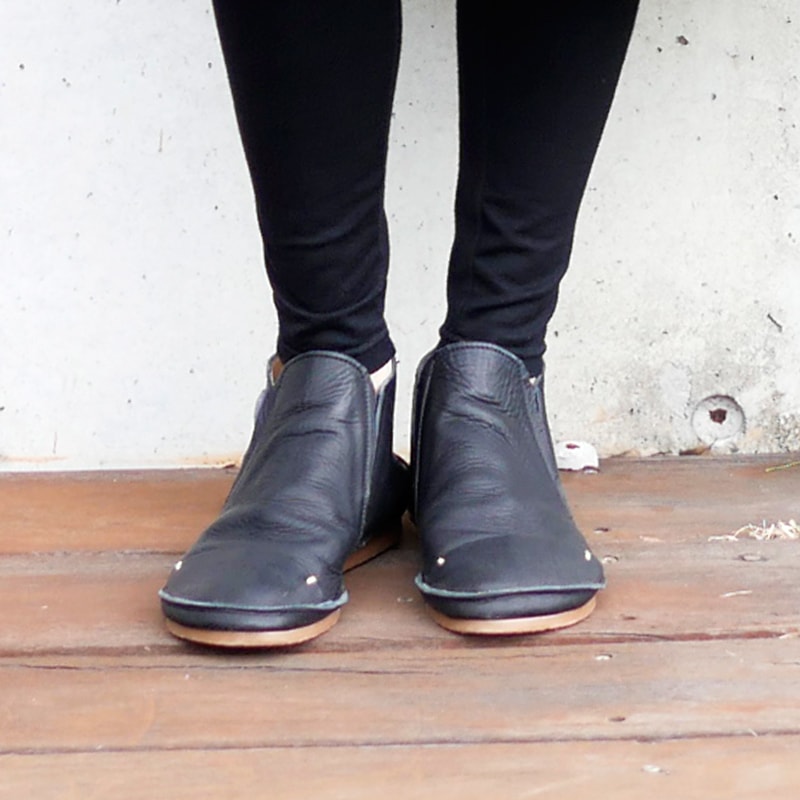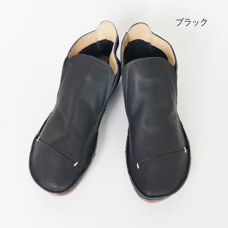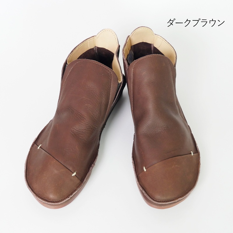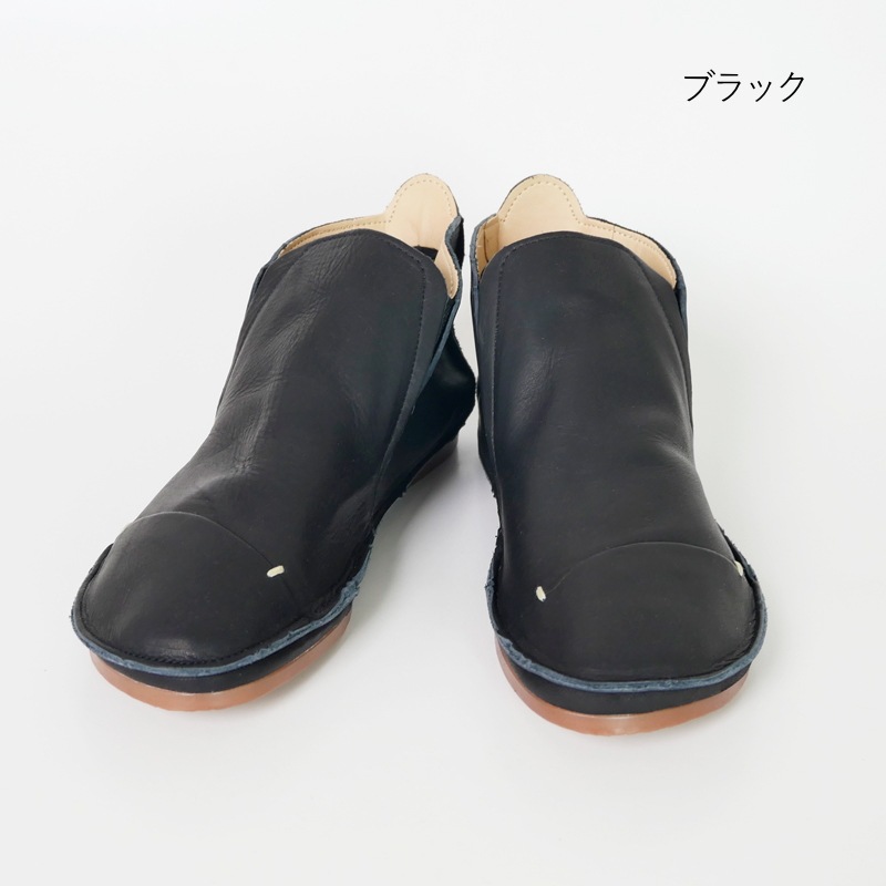 とても柔らかいレザーでノンストレスなショートブーツ。オイル加工した牛革を裏打ちせず、一枚仕立てで縫製の段階から靴の形に整え、縫い上げる袋縫い製法仕上げられている。この丁寧な製法ならではの素朴なデザインがエスニックなスタイルにマッチする。アウトソールには、柔らかめな素材を使用し軽く、インソールにはふかふかのウレタン素材を使用しクッション性が抜群。デザインから縫製まで、大阪の下町で丁寧に作られた安心の日本製なのも嬉しいポイント。