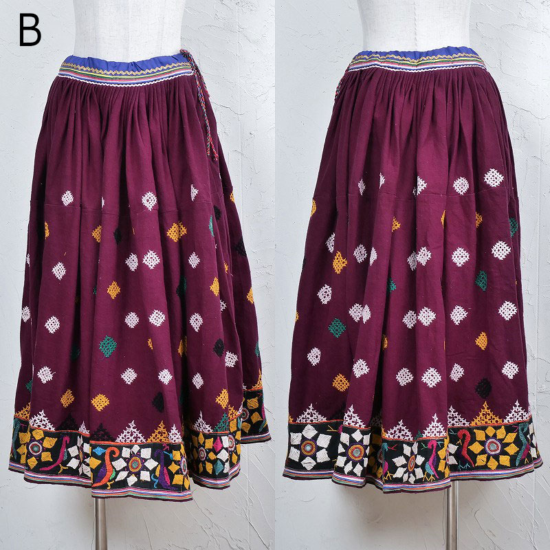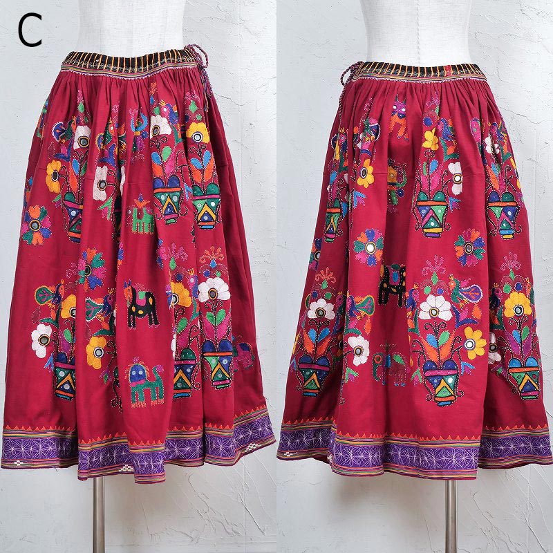 ボリュームのあるロング丈のスカート。落ち着いたワインレッドが印象的。植物や動物をモチーフにしたユニークな刺繍が可愛らしい。赤系に落ち着いたネイビーやブルーの生地を組み合わせる独特の色使いがバンジャラ族の特徴。ウエストの紐を絞ってサイドで結んで着ることができ、普段使いすれば、個性あふれる着こなしに。